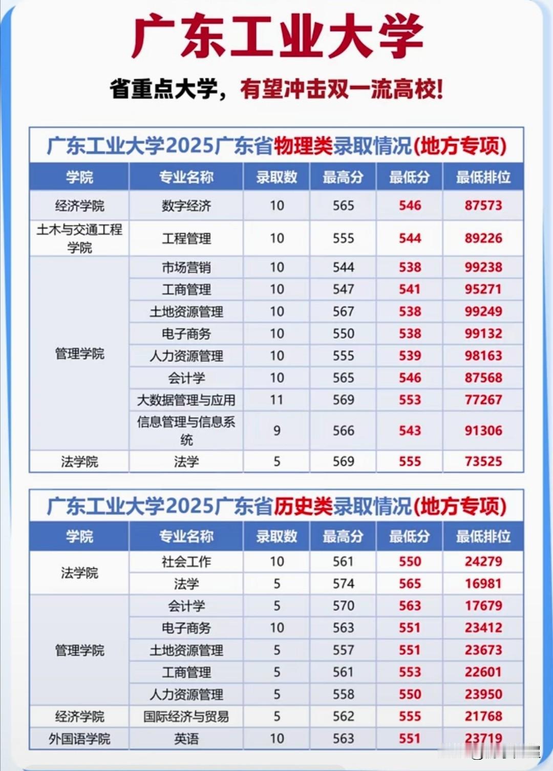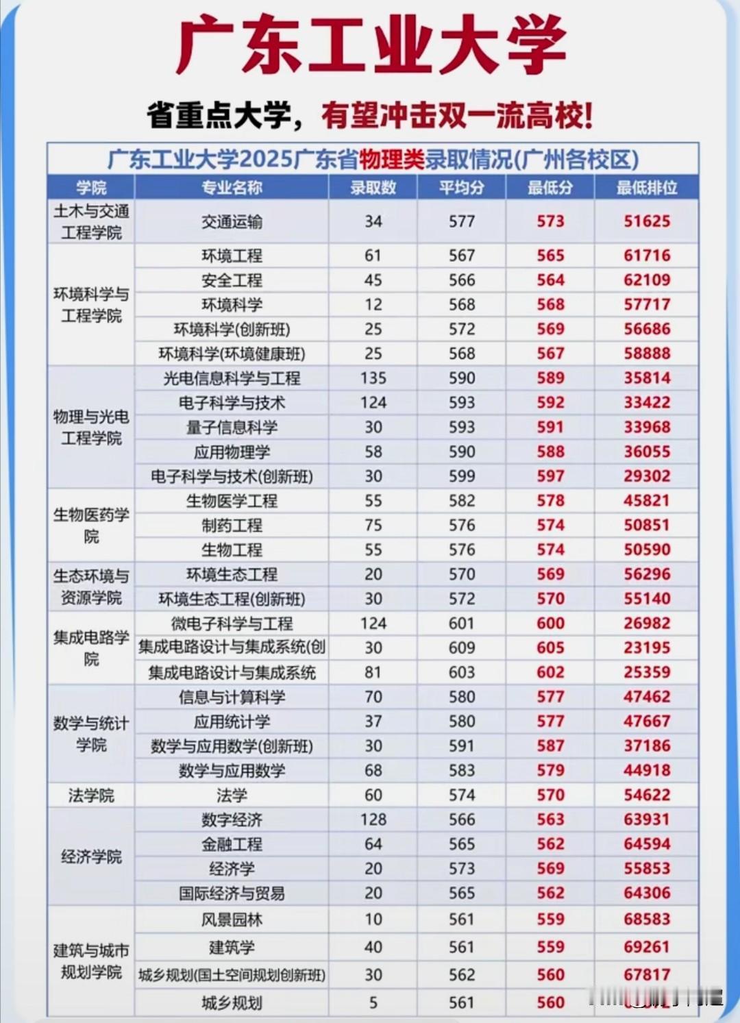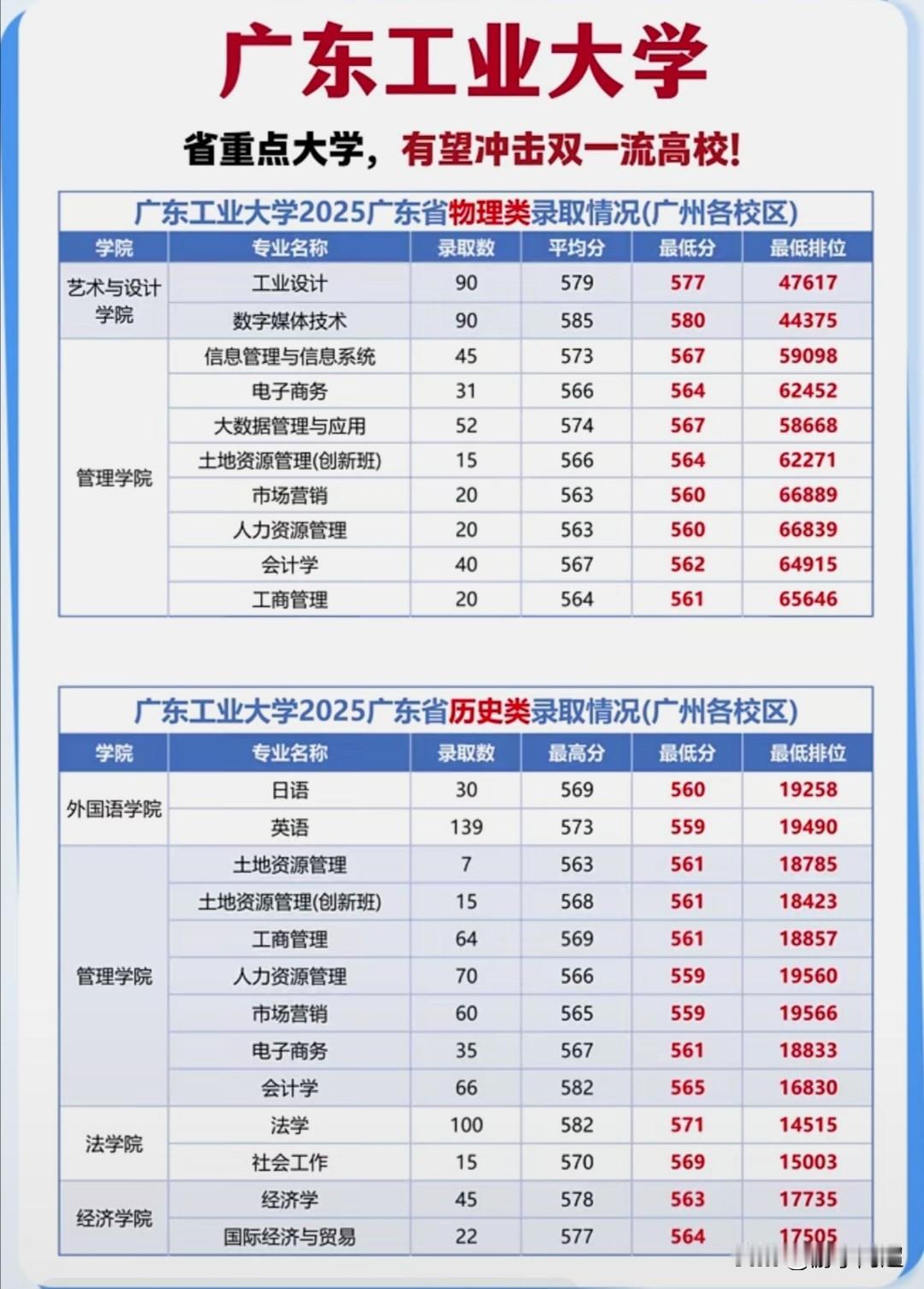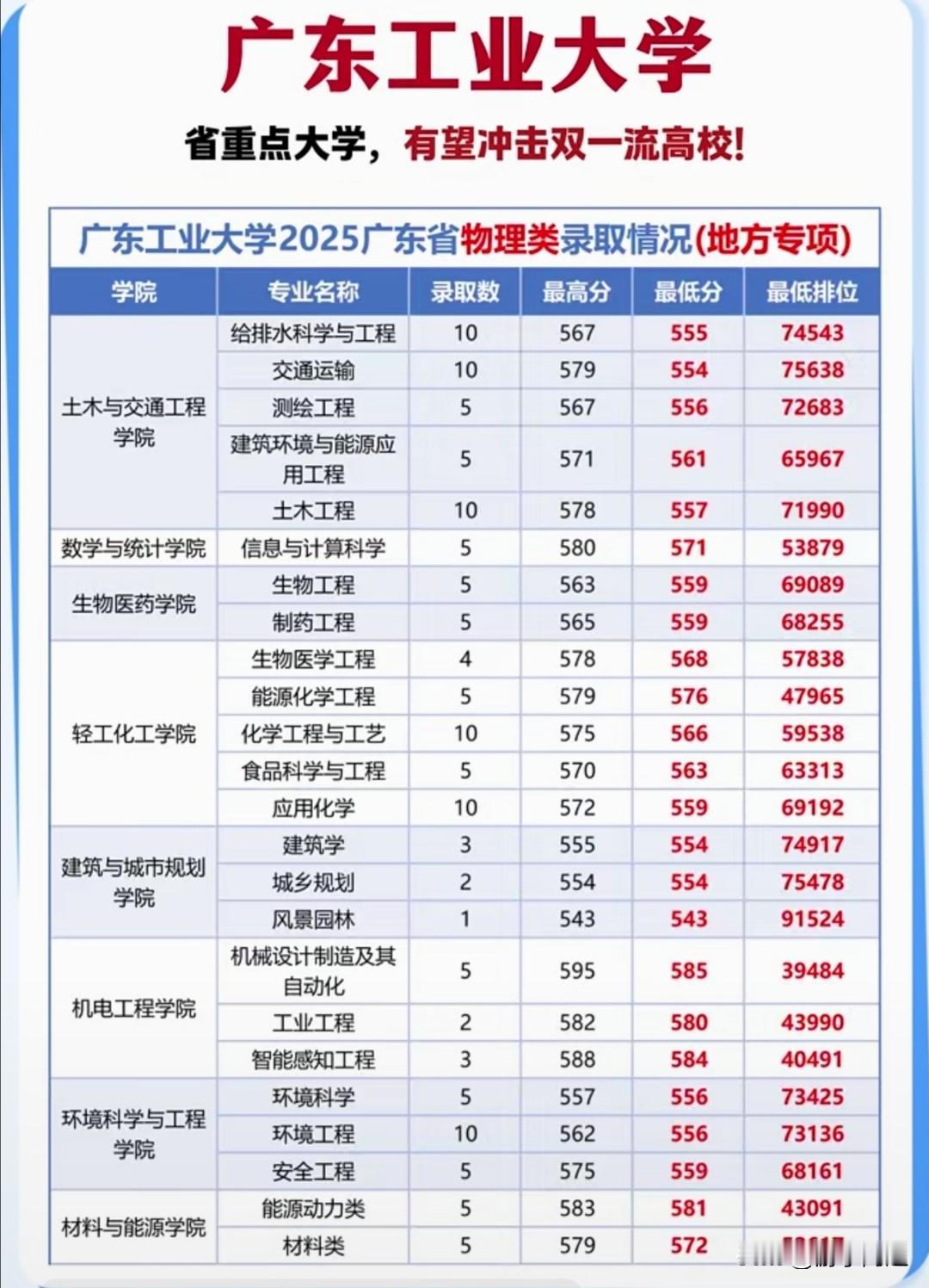 2025年广东工业大学于广东省各专业的录取分数线情况。 广东工业大学虽为双非院校