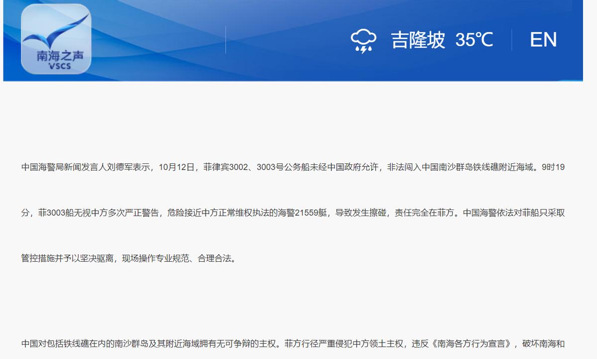 从直升机吹翻,到水炮压制,再到今天的船体冲撞!10月12日,在铁线礁海域,中国海警用一次比一次更强硬的手段,教菲律宾“学规矩”。马尼拉似乎还没明白,每一次挑衅,换来的只会是更猛烈的铁拳。 10月12日,菲律宾方面悍然派出3002、3003号两艘船,伪装成渔业科考船,未经中国允许,非法闯入我国铁线礁区域! 万万没想到,两艘破船刚一露头,就被中国海警21559艇盯上!中国海警这边先是礼貌喊话驱离,眼见似乎没有效果,当场打开高压水炮,展开第一轮压制! 要知道,这水炮可不是浇花的,今年5月就是这艘21559艇,用它瞄准菲方船的桅杆电子设备滋了一下,直接让对方的侦查设备歇菜,既管用又没伤人,当时已经给足了马尼拉面子,这次更是如此,一轮打击下来当场把菲方船员滋的屁滚尿流。 但菲方显然没有吸取教训,上午9时19分,3003号船居然加速往21559艇身上凑,这种危险接近的套路他们用了不止一次,8月在仙宾礁,3002号船就故意冲撞过中方的21551艇,结果自己没占到便宜还反咬一口。 这次中方没再惯着,直接航路管制加船体撞击,,终结了对方的挑衅。 有人说这是升级,可看看过去一年的时间线就知道,中方的手段完全是被菲方的挑衅推着走的:2023年12月仁爱礁,菲方冲闯潟湖,中方还只是拦阻驱离;2024年2月黄岩岛,菲船反复侵闯,中方开始航路管制;5月铁线礁第一次用水炮;8月仙宾礁菲方主动撞船,中方依法管控;到10月,撞击不过是把之前的警告变成了实际行动。 说这不是对等较量,那真是一点没夸张。中国海警现在的家当早就今非昔比,千吨级以上的执法船就有159艘,总吨位快摸到三十万吨,还有两艘万吨级的“巨无霸”压阵,这规模在全球海岸警卫队里都是头一份。 反观菲律宾那两艘3002、3003号,说是公务船,其实吨位小得可怜,设备更是老旧,之前在黄岩岛被水炮滋了29分钟,舰桥玻璃碎了、空调外机掉了,连船员耳朵都被玻璃碴划伤,最后举着白旗就跑了。 这次撞上21559艇,责任全在菲方一点不冤,中方海警的通报说得明明白白,是菲方先无视警告危险接近的。 中国南海研究院的专家早就点破了,菲律宾的挑衅根本就是“有组织有预谋”,他们这是多点配合,背后还有某些外部势力的“指导”,美军在菲律宾部署导弹,菲日搞情报合作,说穿了就是想靠冒险举动刷存在感,塑造自己的“受害者”形象。 就像2024年一年,菲方在黄岩岛、仁爱礁这些地方的挑衅就超过25次,从空投补给到非法登礁,花样翻新,但每次都没占到便宜——他们以为抱上美国大腿就有底气,可忘了美国也就是给点口头支持,真到撞船的时候,连个影都见不着。 马尼拉还想靠这个转移国内矛盾,小马科斯政府政局不稳,就把南海当成了转移注意力的工具,算盘打得挺精,就是没算到中方的反制会一次比一次硬。 铁线礁这地方本就是中国的固有领土,1935年中国就把它划入版图,2024年3月菲方34人非法登礁,中方海警当场登礁查证,还清理了他们留下的垃圾、插上五星红旗宣示主权,仁至义尽了。 可菲律宾偏要违反《南海各方行为宣言》,非要在无人岛礁上搞动作,一会儿想搭设施,一会儿想造事实占领,真当中方的巡逻是摆设?要知道,中国海警2024年光接处警就快两万次,查办案件五千多起,南海的每一片海域都在管控范围内,菲方的小动作根本藏不住。 外交部都说了,你派船闯一次,我就加强一次巡逻;你敢危险接近,我就敢依法撞击。9月菲船在黄岩岛被水炮打跑,10月铁线礁被直接撞停,这就是最直接的教训。 马尼拉要是还拎不清,南海不是谁的后花园,更不是转移矛盾的工具,想靠挑衅占便宜,觉得靠碰瓷能捞好处,下次可能就不是撞击这么简单了——毕竟中国海警的新船还在不断下水,1500吨级的新巡逻舰刚出厂,装备着先进雷达和主炮,对付这种挑衅简直是绰绰有余。