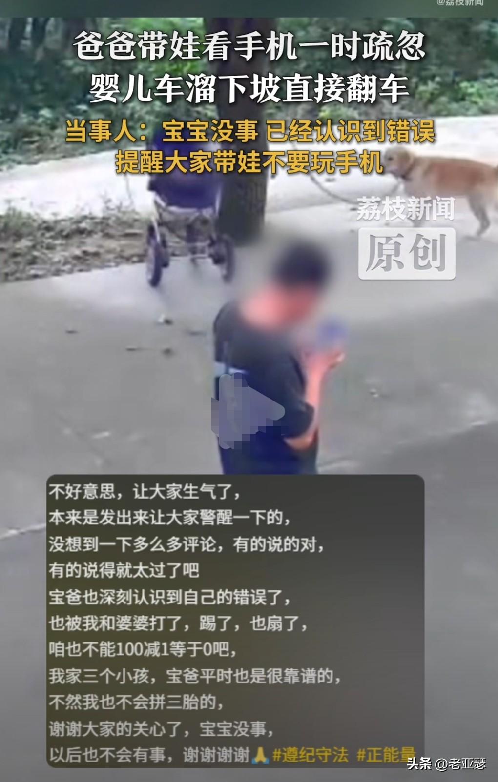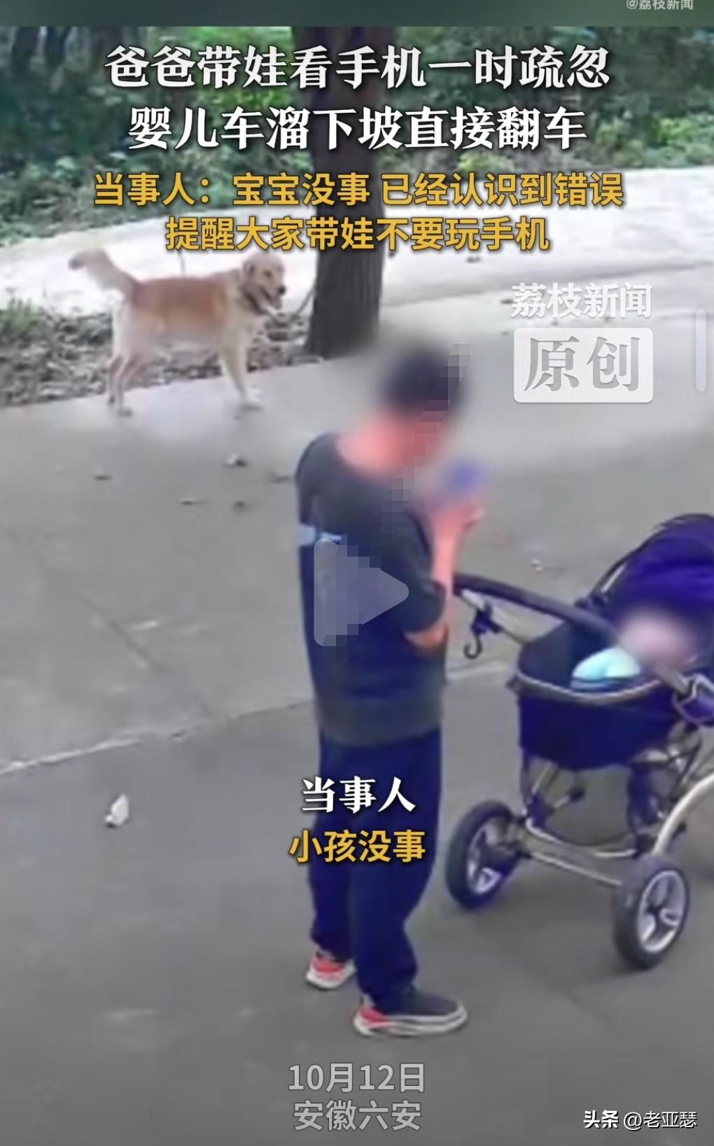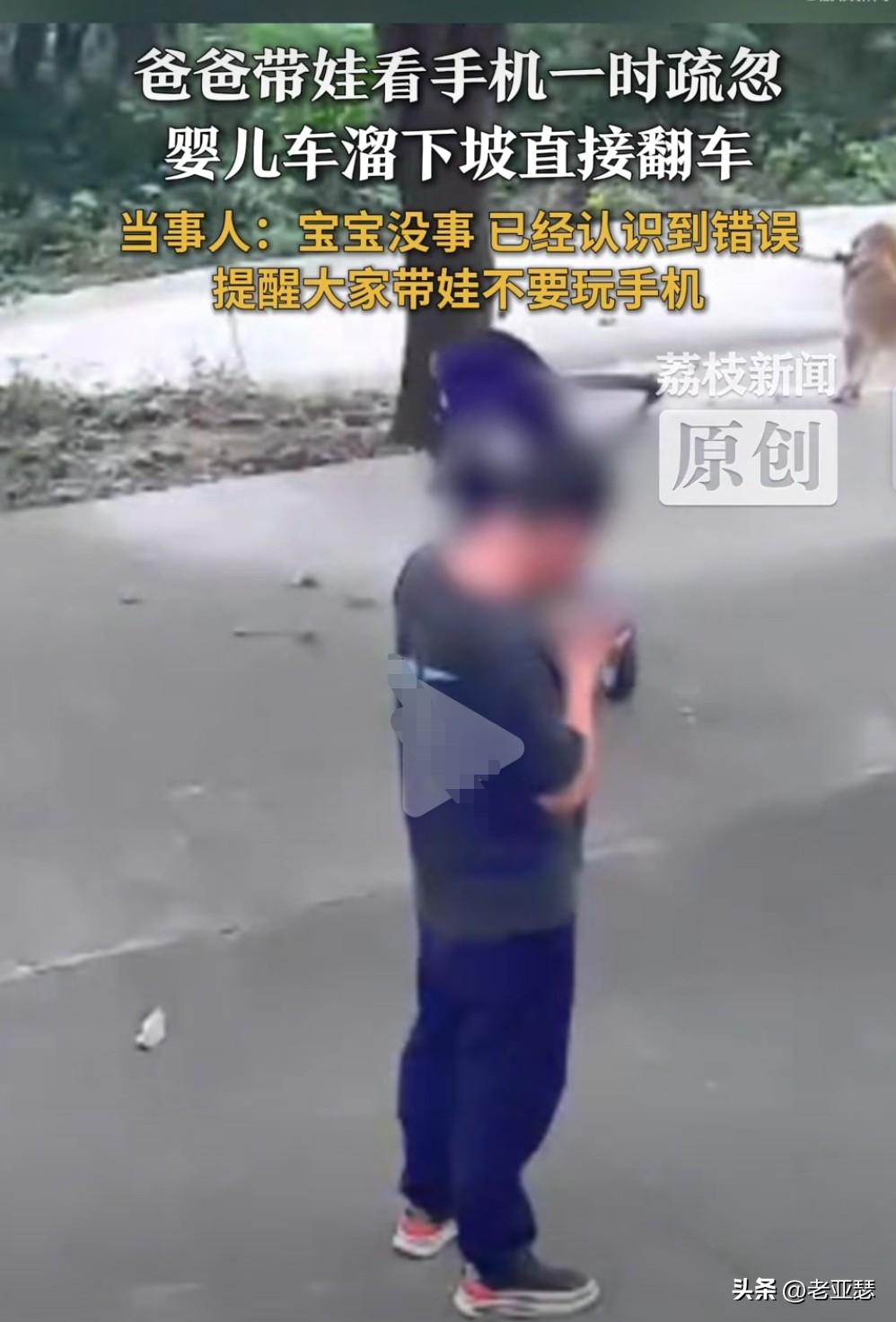 这真是敲响了警钟啊!幸亏没有酿成大祸。 10月12日,一男子带娃,玩起了手机,没有管婴儿车了。 他实在是太痴迷了,这婴儿车溜了好几米,他都没有反应,依然在那里玩手机。 旁边的狗都看见了,他还没有看见。 男子最终发现婴儿车翻在地上后,也是后怕不已。 男子的老婆将此事发布网上,这名男子遭到大量批评。 带娃还是要有点责任心。