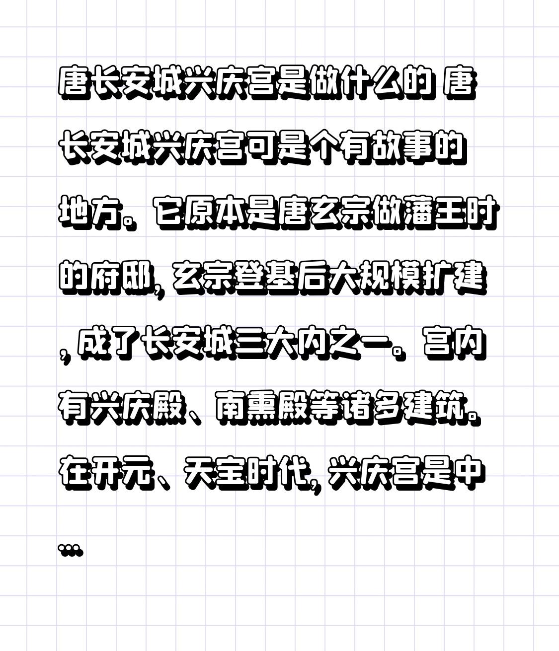 唐长安城兴庆宫是做什么的唐长安城兴庆宫可是个有故事的地方。它原本是唐玄宗做藩王
