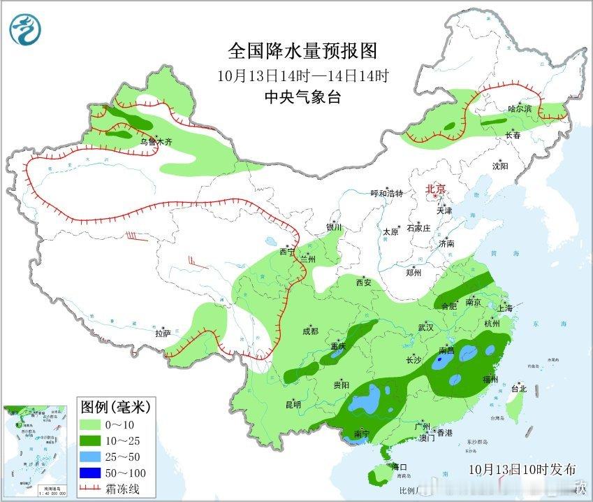 今天下午到明天中午,南方降雨范围依然不小,在925百帕切变线附近的广西北部、江西中部、福建西部、浙江南部可能出现大雨。另外新疆北部因为冷空气影响,也会出现降水,天山高海拔地区可能还有降雪。