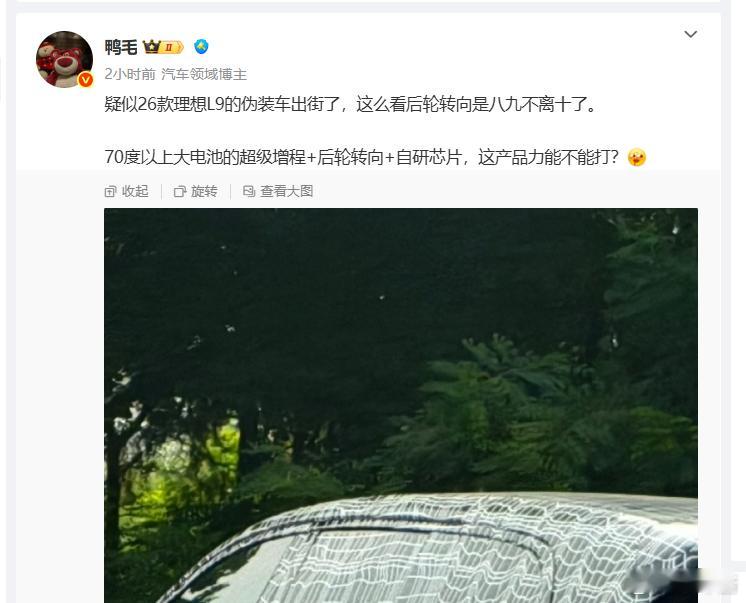 26款理想L9,70度以上大电池的超级增程+后轮转向+自研芯片
