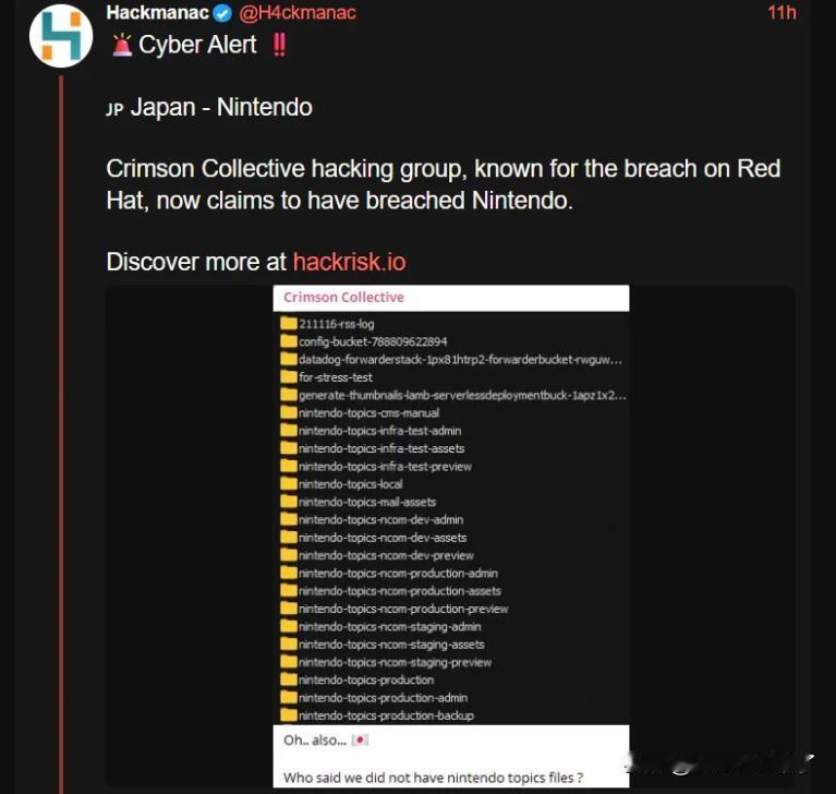 【任天堂要头痛了!】任天堂看来要为模拟器和破解头痛之外,现在又多一个头痛的了! 据外媒报道,一个名为“Crimson Collective(深红集体)”的黑客组织声称已成功攻破任天堂内部系统,并发布多张疑似内部资料截图作为证据,内容包括生产资产、开发者预览版本及备份文件。 业内分析认为,若此次黑客攻击得到证实,任天堂或将面临潜在的数据泄露风险。此前,任天堂曾遭遇类似安全事件,导致部分用户账户受到影响。 任天堂方面尚未对此事发表任何官方声明。