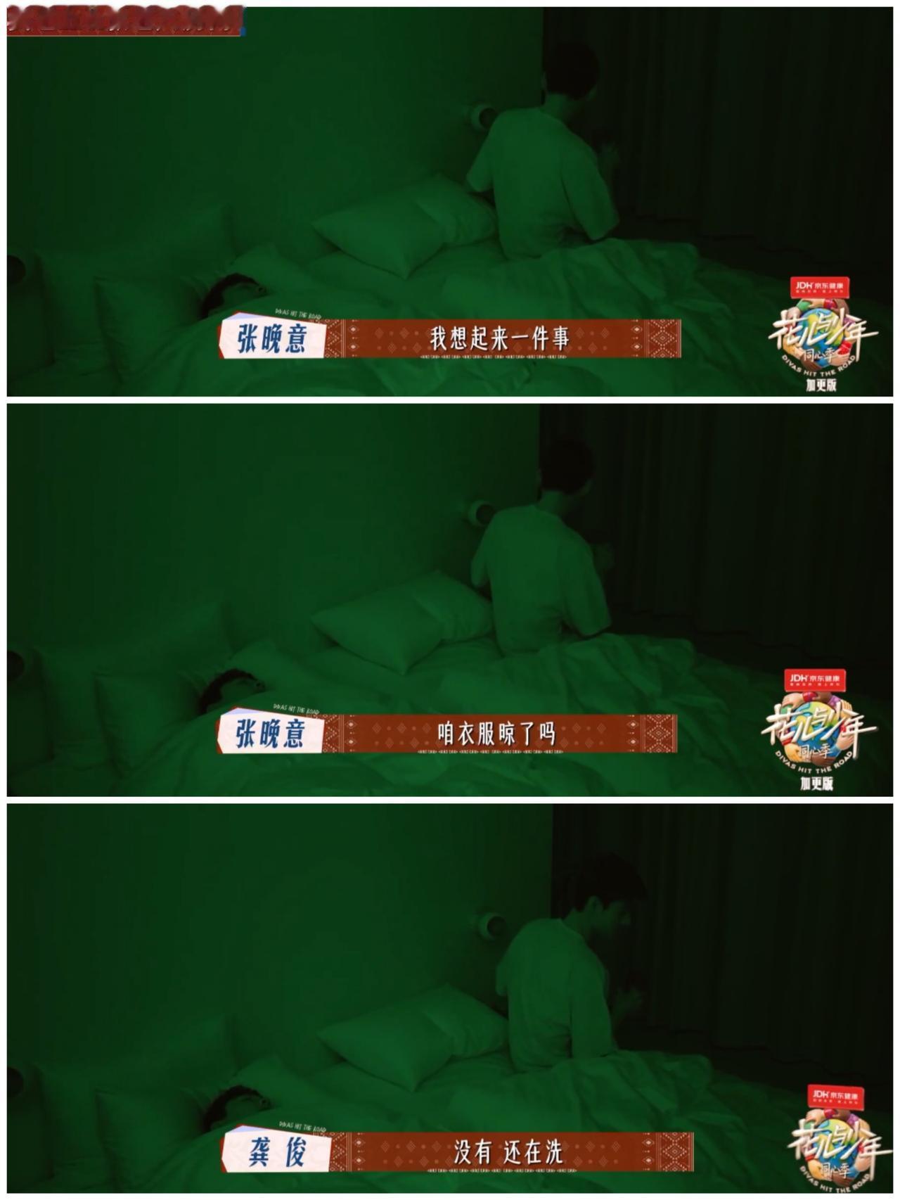 哎呀,龚俊连这个事情都帮张晚意干, 这样下去可不行呀, 张晚意快被他“宠”坏了。 张晚意刚想好好入睡, 看到龚俊, 突然想起衣服是否晾了。 龚俊回答没有。 因为他选错洗衣模式, 导致要洗一个多小时, 他实在太困了, 等不及了 想明天再晾。 张晚意继续追问 这样衣服是否会馊了。 龚俊无奈回答 馊了就重新洗呗 哎呀, 张晚意自己的衣服要龚俊帮忙洗和晾, 结果龚俊因为选错模式 就决定明天再完成这个事情。 但是张晚意自己似乎又有点洁癖, 担心衣服馊了, 自己躺在床上, 问人家有没有洗和晾, 明显自己不想动了。 他那么担心搜了, 等下自己起床去晾呗, 自己又太困了, 只是在床上只说不做。 按理说, 如果张晚意真的在乎这个事情, 就真的会硬生生等衣服洗完晾完再睡的。 但是他嘴上说完就睡了。 看来龚俊也太宠张晚意了, 连衣服都帮他洗和晾。 我以为龚俊 只是在张晚意需要时帮助一下, 没有想到连日常生活的衣服都包了。 真的把他宠成“巨婴”了。 也许网友会说, 不就是洗和晾衣服吗? 随手一干的事情哎呀。 如果了解男生的话, 都知道 他们如果家里有人 是绝对不会干这些事情的。 想他们伸出他们的“金手”干这个事情 难如登天。 不要说洗晾别人的衣服, 自己的衣服都不一定洗晾。 龚俊可以为张晚意干这个事情, 看来他们交情很深呀。 不然就是龚俊太“绝种”好人了。 不过, 也许龚俊和张晚意是轮流 帮对方干这个事情的吧。 他们都不是心安理得享受别人帮助的人, 更加不可能把对方当作免费保姆。 他们都是很有分寸感与边界感的人, 很会尊重对方。