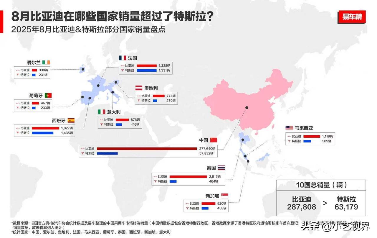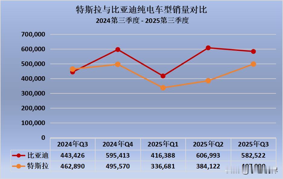 连续四季度领先特斯拉,比亚迪加速重塑全球电动车格局 先看一份比亚迪、特斯拉全球纯电销量对比数据: 2024年四季度:比亚迪 595413,特斯拉 495570 2025年一季度,比亚迪 416388,特斯拉 336681 2025年二季度,比亚迪 606993,特斯拉 384122 2025年三季度,比亚迪 582522,特斯拉 497099 比亚迪不止在2025年三季度季以582522辆销量领先特斯拉85423辆,而是连续四个季度在全球纯电销量上领先特斯拉。据彭博社分析师预测,比亚迪在2025年预计将交付217万辆纯电汽车,特斯拉预估交付161万辆。 在全球纯电汽车市场,比亚迪将持续扩大领先态势,2025年1-9月海外销量已突破70万辆。其中,比亚迪8月在西班牙、法国、意大利、爱尔兰、葡萄牙、奥地利等欧洲国家及新加坡、泰国、马来西亚等东南亚国家的汽车销量,均超过了特斯拉。 随着新能源汽车行业的不断变革,中国汽车品牌的势能逐步攀升,特别是比亚迪坚持“技术为王,创新为本”的理念不动摇,不断的提升产品核心竞争力,推出覆盖全价位段多元化车型,从本地化生产到组建8艏滚装船,再到海外建厂搭建完整的售后服务体系,比亚迪用雄厚的技术累计和前瞻性的市场布局,将中国汽车产业从跟随者带到了行业引领者,重塑全球纯电车格局!