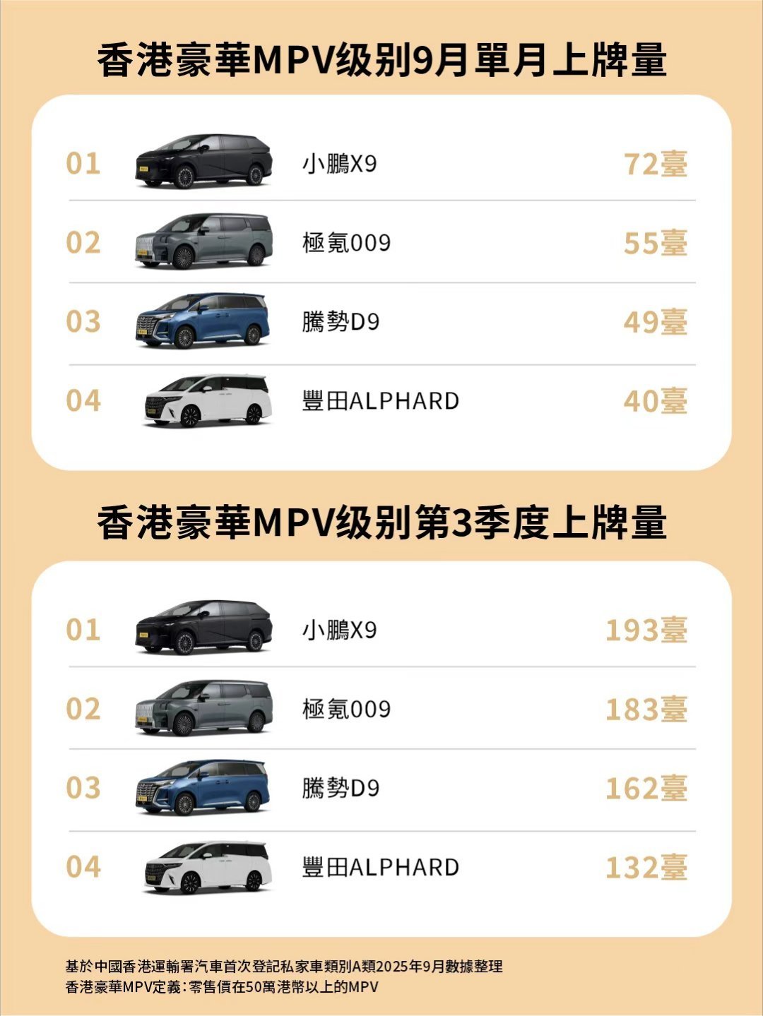 小鹏X9在香港卖爆了!小鹏X9在香港又一次超越埃尔法,登顶9月豪华MPV销量榜首,并以193辆的上牌量成为香港第三季度豪华MPV上牌量第一,斩获9月及第三季度豪华MPV双料销冠。