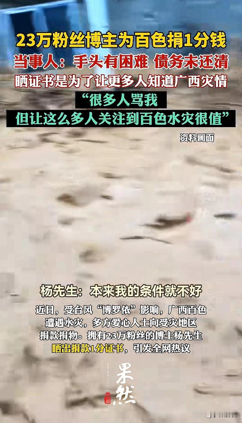 23万粉丝博主为广西百色捐款一分钱,引发大量争议。 据相关媒体报道,有一位粉丝量为23万的博主,在平台晒出了给广西百色市慈善总会为抗洪同行活动捐款1分钱的截图。 由此引发了大量的争议,认为是作秀,但本人回应说是因为本身有债务没有还完,且这样的行为只是为了希望大家关注百色洪水。 不知道你怎么看这样的事情,我觉得本身就是作秀,为了吸引流量,再穷捐个50.100没问题,但那样就没有人知道这个事情,反而故意用一分钱来搞个噱头。