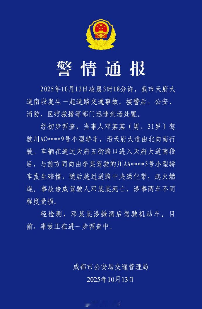 【天府大道车祸系酒驾事故】警方通报成都天府大道车祸事件 10月13日,发警情通报: