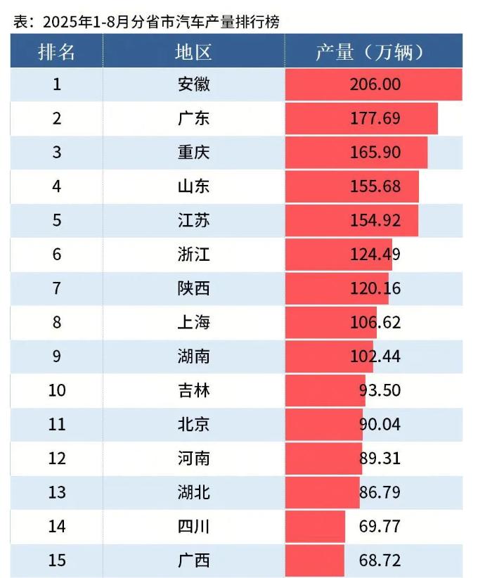 2025年1月至8月各省市汽车产量出炉,安徽、广东、重庆产量位居前三名。 最近10年以来,新能源汽车的渗透率越来越高,传统燃油车面临很大冲击,以前的汽车大省吉林、湖北已经落伍了。 新能源汽车产量已经将成为汽车第一大省竞争的第一关键要素。 坐拥二汽的湖北,汽车产量已经不及四个邻居安徽、重庆、湖南、河南了。