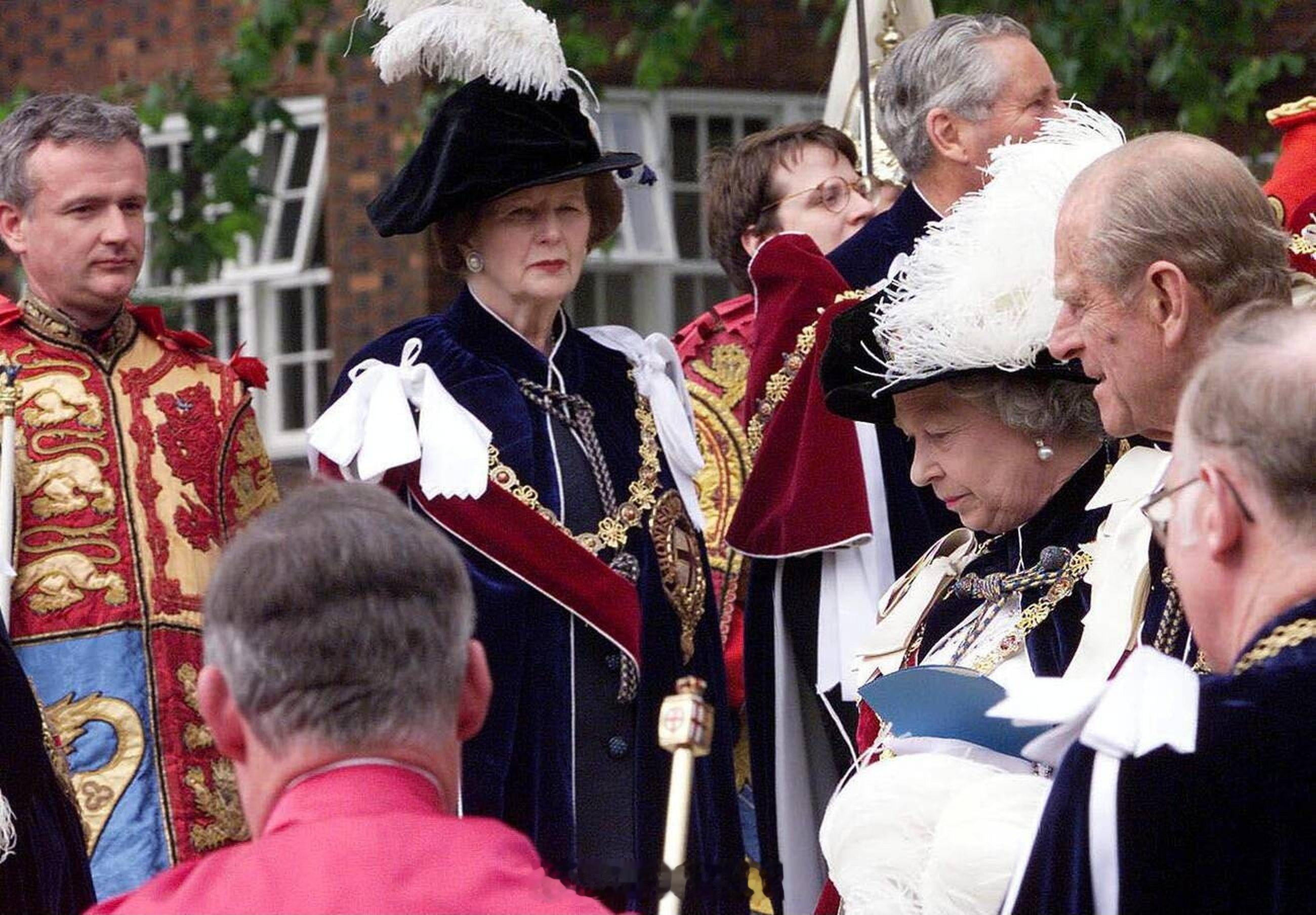 1999年6月14日,伊丽莎白二世女王和爱丁堡公爵菲利普亲王在温莎城堡圣乔治教堂出席嘉德日活动,他们经过的是前首相撒切尔夫人📸撒切尔夫人已于1995年4月25日获得嘉德勋章。