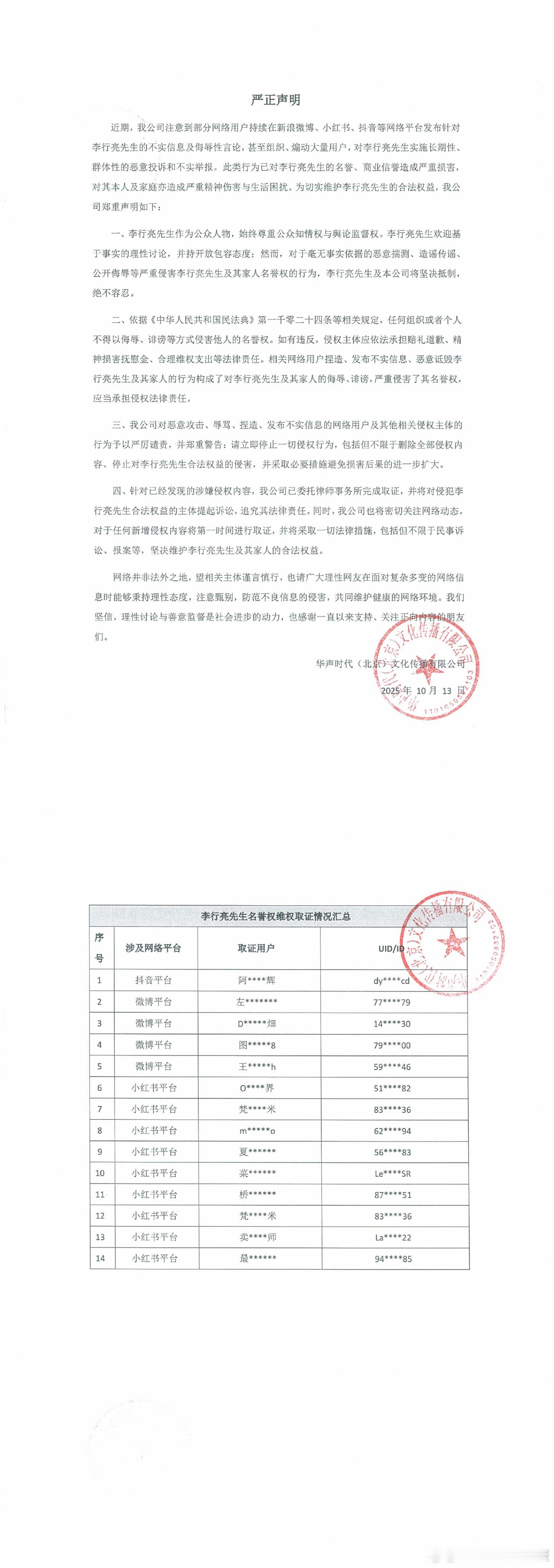 李行亮工作室维权李行亮工作室发声明10月13日发布声明,针对网络用户发