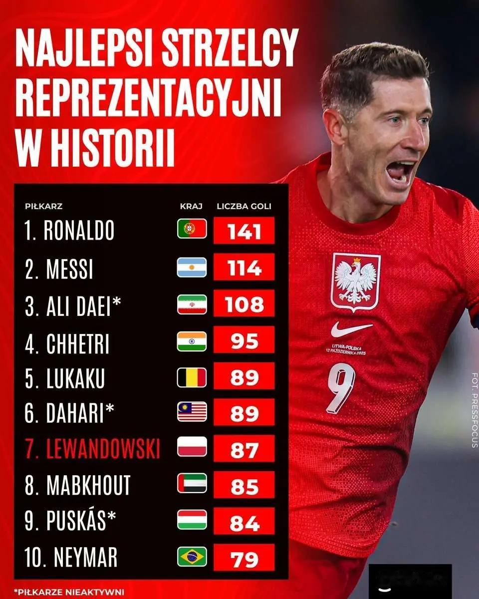 国家队历史射手排行榜单,梅罗领衔,莱万在列,具体如下: