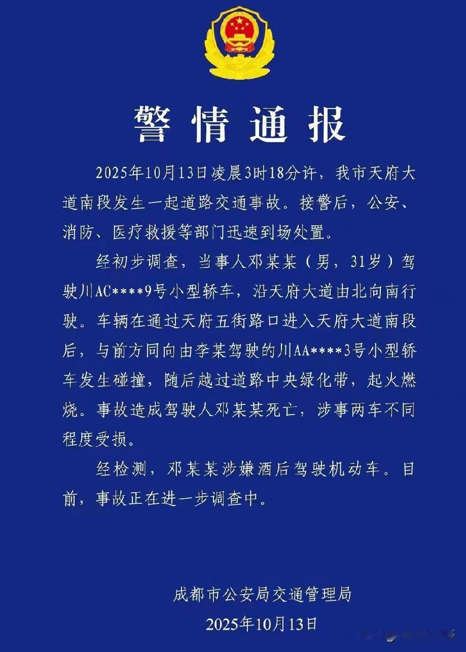 10月13日凌晨成都小车起火燃烧通报来了。 起火燃烧小车司机才31岁,当天喝