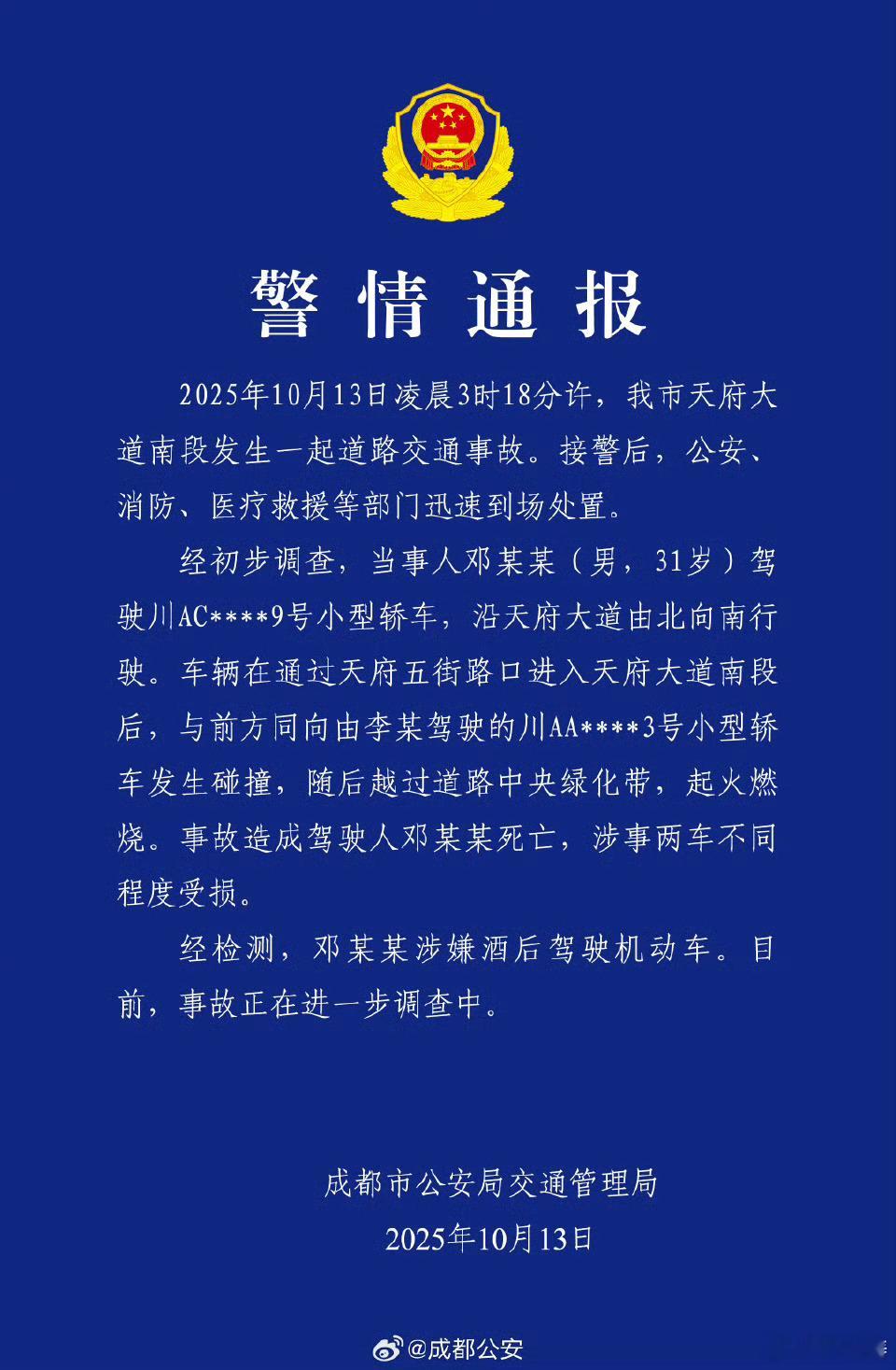 成都警方通报一车辆失控后起火官方通报:酒驾事故。