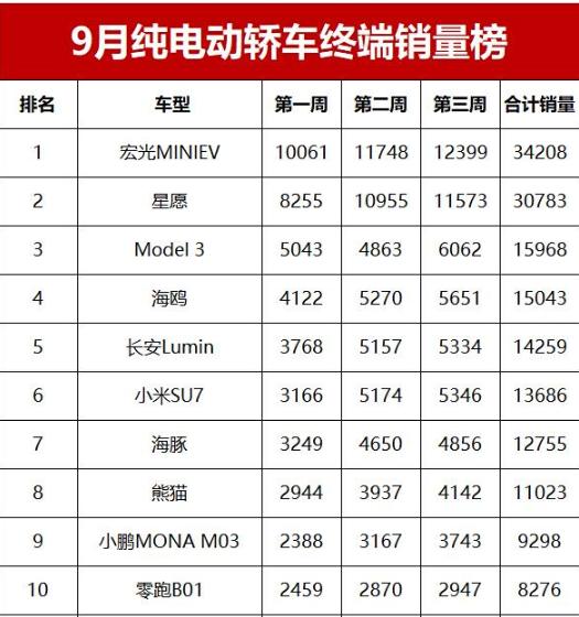 虽然新能源车的平均价格早已超过了燃油车,但新能源车的主体仍是性价比。 今天同事的朋友要买MG4,我才关注了一下这个从“荷尔蒙”车型之后已经许久没有关注过的品牌。结果不差不知道,这款我没在意过的小电车9月前三周卖了8186辆,在全部的电车里排第11名。按照这个数字去推算,这款车整个9月份销量应该妥妥过万。 更让我感兴趣的是,在这个销量排行表里,前13名车型中有8款属于10万以内的A0或者A00级小电车。也就是说最畅销的电车里有小型电车的占比超过了60%。排名第一的依然是超低价的五菱宏光MINI EV;紧随其后的则是吉利的星愿,这款小车在9月份卖出了超过5万辆的成绩,已经是继6月份销量突破4万之后,连续第四个月销量破4万了。除了这两位之外,比亚迪海鸥、长安的糯玉米、吉利的熊猫也在前十之列。 在这些小车当中,除了宏光MINI EV更靠价格冲量之外,其他的诸如星愿和MG4这种小车更靠的是性价比。你想,6万多的价格,起步300公里的续航,即使打个七折,也完全够一周的上班通勤使用了。而MG4更是直接把起步续航干到了437公里,还是6万多的价格。低价、长续航之外,这些小车还给你智能座舱,虽然8155的芯片在20万左右的车型上不那么先进,但在10万能以内的小车那也是妥妥的领先。所以,价格便宜,续航够用,还能提供情绪价值,你说这些小车的走红是不是就可以理解了。