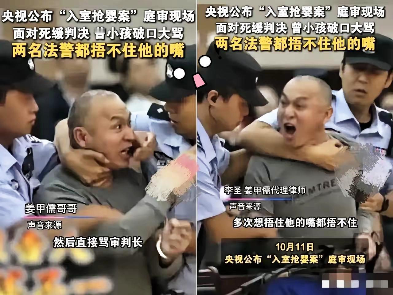 真的看吐了! 央妈一曝光姜假如入室抢劫案的曾某孩儿,才算让大家看清这恶人的真面目。 抢了人还敢在法庭上撒野,骂家属、怼审判长,眼睛里全是凶光,居然还放话“出来要让姜家人好看”! 工作人员想制止他那张喷粪的嘴,他还疯狂躲开,半点儿悔改的样子都没有,把姜妈妈气到浑身哆嗦,出了法庭站都站不稳。 这种人哪是一时糊涂?根本就是打心底里没把法律和别人的痛苦当回事儿。 要是给他减刑放出来,指不定还会犯更大的错,就是个定时炸弹! 法律本来就是给好人撑腰、给坏人设限的,对这种毫无悔意的恶,就该让他在“笼子”里好好反省,别再出来害社会。 你觉得对这种嚣张的罪犯,该不该从严处理?评论区说说你的想法!