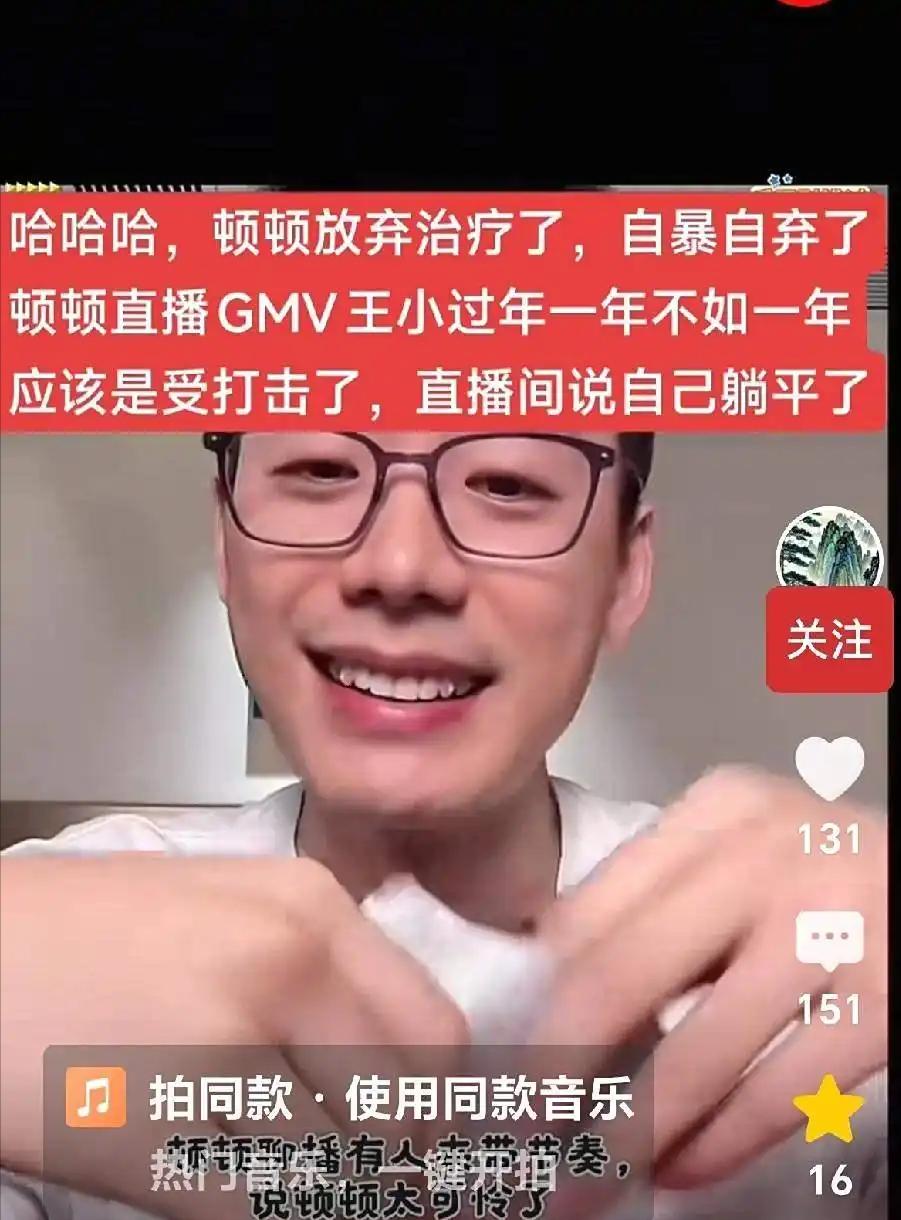 相比于刚离职时董宇辉的如履薄冰,前东方甄选主播顿顿就有些狂了。 现在只有200多万粉丝的他,还比不上董宇辉的一个零头多,但他就敢组建一个70多人的团队专门为他服务,还美其名曰:创业好简单,没有压力。 因为在他看来,东方甄选的美丽生活号是他的杰出代表作,自己自立山头且成功复刻与辉同行简直轻轻松松。 殊不知,美丽生活号是由当时还没离开的董宇辉在大号引流,主播冬冬男穿女装,董董直接开播洗头,还有大琪不顾形象的戴假发。 每个人都使尽浑身解数,才有了美丽生活号的羽翼丰满。 不可否认的是,当顿顿一身西装在播的时候,确实人数会多一些。但也不能因为他的出色,就抹煞了那么多小伙伴的努力啊! 记得当年,不可一世的文章在面对郭德纲采访的时候就说自己太顺了,顺极了,连当时还不太火的老郭也得捧着他。 十年河东,十年河西。现在的文章自从“周一见”事件过后,快在圈内查无此人了,至多是他陪孩子上舞蹈课时等再上一次热搜。 再看此时的文章,再没有了年少时的轻狂,只剩下不到40岁就满头的白发,满脸的憔悴。 而此时的顿顿好像也在走这样的老路,直播人气从先前的10万以上,已经掉到了只有一万,有时候竟只有几千人。 镜头前的云淡风轻掩盖不了心底真实的声音:大家快来下单啊!真的和当年温润如玉的公子形象相去甚远。 当年董宇辉给老东家创造了巨大的流量,老东家不知道。 老东家给顿顿灌满流量,顿顿也不自知。 到底真的是肥美黄多的大闸蟹本蟹,还是大闸蟹身上的草绳,估计很快就会见分晓了吧!