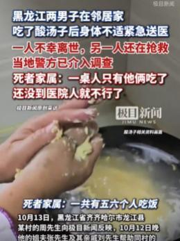 “防不胜防!”10月12日,黑龙江齐齐哈尔,一男子到邻居家做客吃饭,席间食用了酸汤子,随后他的身体就出现不适,被紧急送往医院,但由于距离较远,男子到半路时人就已经不行了,网友:管住嘴最重要! 酸汤子这东西相信不少人都在新闻上看过,近年来因食用酸汤子导致的悲剧频频发生,曾有家庭因食用存放过久的酸汤子家破人亡,可还是有人不长记性! 一男子去邻居家做客被留下吃晚饭,席间他和另外一名亲戚食用了桌子上的酸汤子,随后两人的身体先后出现不适的症状,一开始都没在意,随着症状加重他们才意识到不对,大家赶紧将两人送往医院。 这个村子距离医院较远,车子行驶到半路时,男子就已经快不行了,送到医院时不治身亡,另外一名亲戚还在ICU抢救,目前有没有抢救过来还是个未知数。 酸汤子是用玉米水磨发酵后做的一种食物,外表就像是粗面条,它本身是无毒的,但这种发酵食物存放时间长极易产生米酵菌酸,尤其是现在正值夏秋交接之际,温度高湿度大,相对来说更危险。 不少网友表示病从口入,管住嘴最重要,酸汤子这类的酵米面食物,尽量少吃,即使要吃也要当天做当天吃! 信息来源:《黑龙江两男子在邻居家食用酸汤子后一死一伤,警方已介入调查》极目新闻