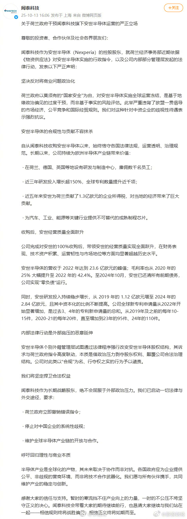 【闻泰科技回应荷兰政府干预运营#