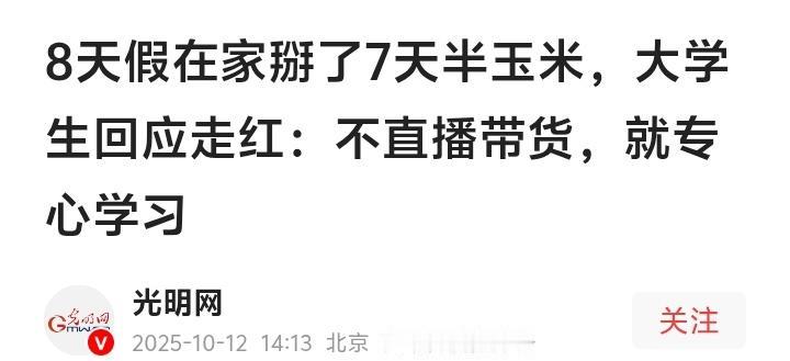 山东19岁大学生国庆8天狂掰7天半玉米拒绝百万流量诱惑:我要用代码改变农业而不是当网红! (来源:光明网、封面新闻综合报道) 秋日的山东潍坊玉米地里,一个身影在金黄穗浪间起伏。19岁的孟成弓着腰,双手飞快地掰下玉米投入筐中,汗水顺着少年稚嫩却坚毅的脸颊滑落。这个国庆假期,当同龄人忙着旅游打卡时,他却在5亩玉米地里完成了7天半的“特殊作业”。一句“我多干一点,父母就少苦一点”的朴素心声,瞬间击穿千万网友的心理防线。 爆红来得猝不及防。社交媒体上,他徒手掰玉米的麻利动作、招呼同学帮忙时的爽朗笑声,与那些精心设计的网红视频形成鲜明对比。有人算了一笔账:若趁势直播带货,这位“全网最朴实大学生”或许能轻松赚到父母卖水果十年的收入。然而流量汹涌而至时,孟成却选择关上这扇名利之门:“玉米是当粮食卖的,没法带货,我更想专心读书。” 深夜的电话采访里,他的声音带着疲惫却坚定。面对“炒作”质疑,他苦笑:“有些人就是这样的。”而父母凌晨五点的叮嘱短信,更透露出农民家庭最本分的价值观——“低调做人,踏实做事”。这种刻在骨子里的淳朴,与追逐快钱的网络风气碰撞出强烈反差,也让人们开始反思:当流量成为硬通货,为何总有人逆流而行? 镜头转向孟成家的水果摊。一辆三轮车、几只箩筐,便是全家四口的经济支柱。姐姐读研、自己上大学,父母的担子从未放下。可提及“吃苦”,少年语气轻描淡写:“农村孩子谁没干过农活?土地是牵挂,不是负担。”这种对苦难的坦然接纳,恰是当代年轻人稀缺的生命韧性。有网友感叹:“他弯腰掰玉米的背影,比任何励志演讲都更有力量。” 爆火一周后,孟成悄悄置顶了一条回应视频。画面里他指着身后的玉米地:“我想读研用计算机技术助力农业,让农民少流汗。”没有煽情台词,却让无数人看到科技与土地碰撞的希望。农业专家指出,我国农业数字化率不足10%,孟成梦想的背后,正是乡村振兴最急需的年轻力量。 这场流量与初心的博弈中,孟成选择将人生的玉米一粒粒剥进知识的粮仓。有评论一针见血:当网红泡沫退去,真正推动社会的永远是这些“不抬头看热搜,只低头种理想”的年轻人。他的选择如同一面镜子,照出浮躁时代里最珍贵的定力——用深耕对抗浮华,用专业赢得尊重。 山东 19岁 大学生假期 假期 孟成掰7天半玉米 掰7天半玉米 青春担当 乡村振兴