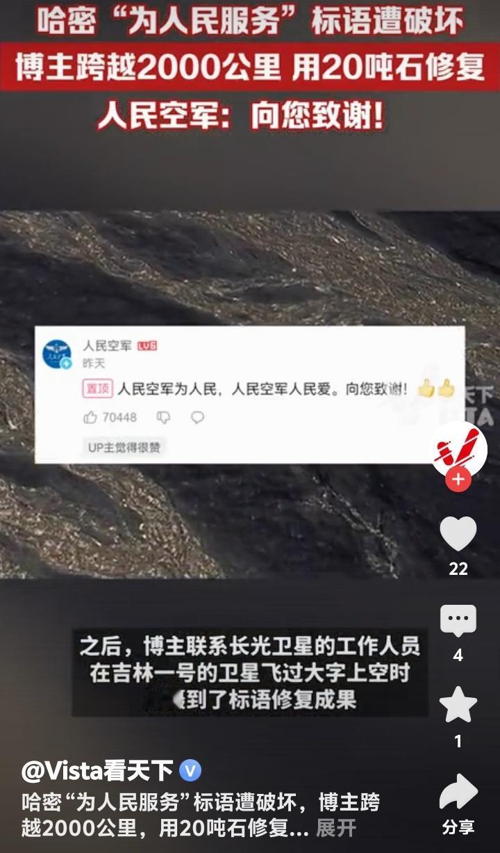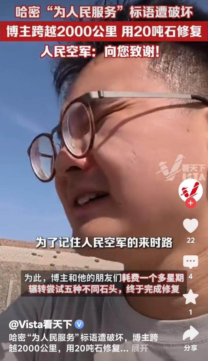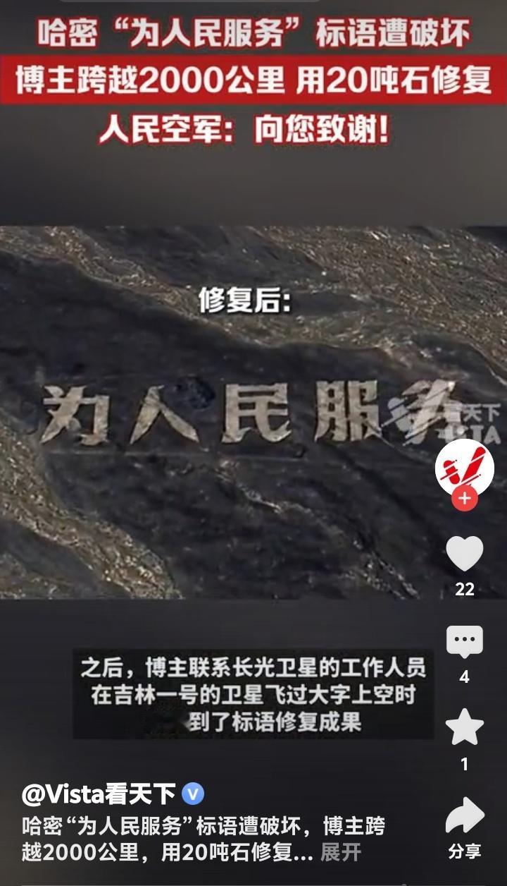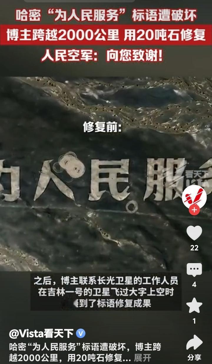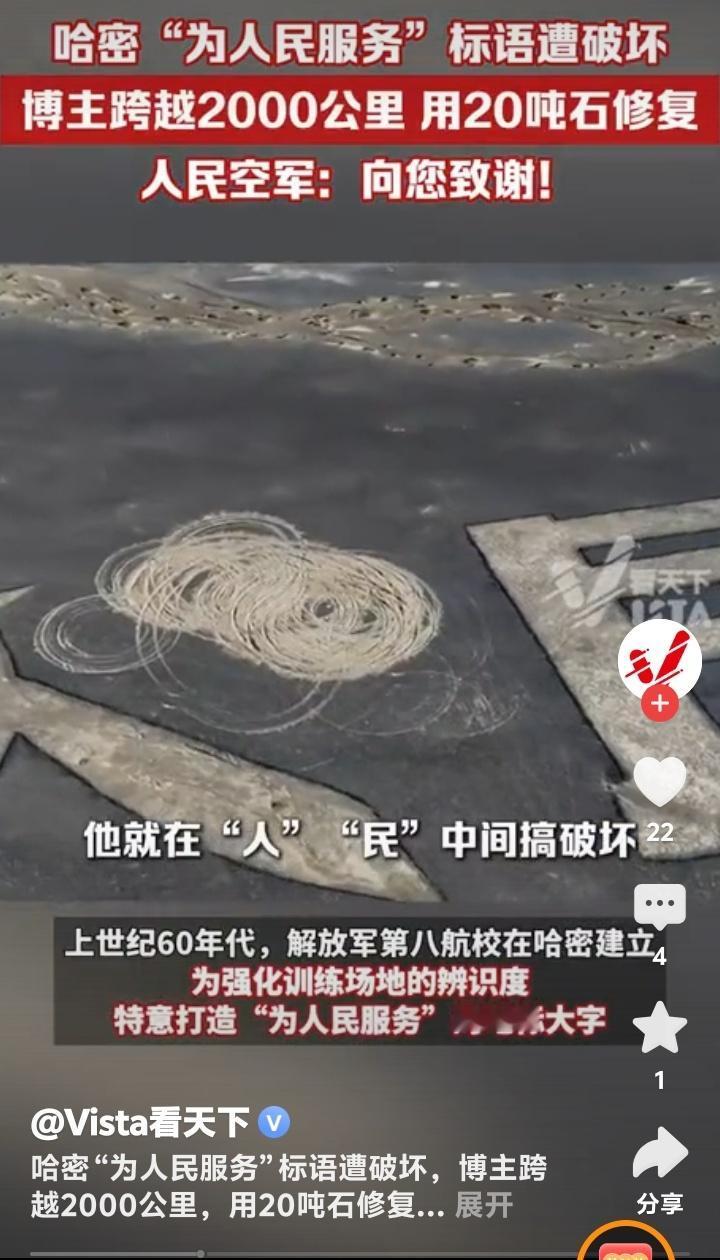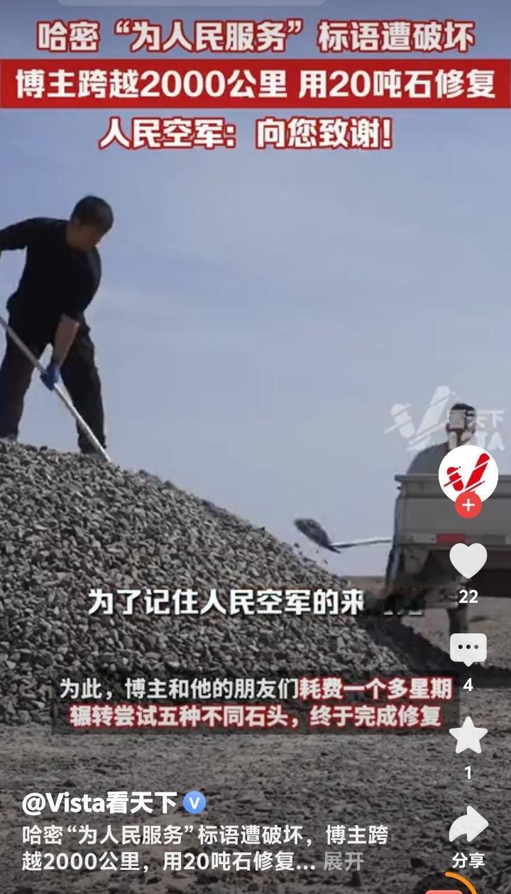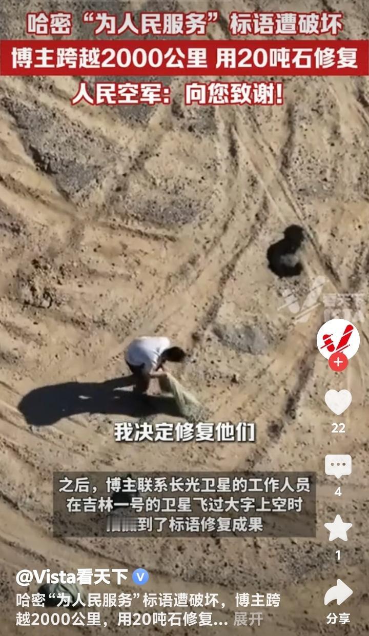 新疆哈密戈壁滩震撼一幕!60年风沙吹不倒的“为人民服务”竟遭恶意漂移破坏,博主驱车2000公里动用20吨石头修复,人民空军亲自致谢引爆全网泪点! (地址:新疆哈密戈壁滩) 茫茫戈壁,黄沙漫天,五个用白色石头垒成的巨字——“为人民服务”,静静矗立在新疆哈密的荒原上六十余载。它们曾是解放军第八航校官兵用双手一块块铺就的精神丰碑,是飞行员们穿越云层时最坚定的航标。可谁能想到,这段承载着几代人信仰的印记,竟被一辆肆意漂移的汽车无情撕裂!车轮碾过的不仅是石头,更是无数人心中那片最珍贵的净土。 当博主“略靠谱旅社”通过卫星地图发现这一破坏时,远在2000公里外的他瞬间揪紧了心。视频里,原本庄严的标语被车轮划出刺眼的伤痕,“人”与“民”中间赫然留下一道扭曲的缺口,仿佛有人在“人民”二字间硬生生劈开了一道裂痕。网友愤慨评论:“左边是个人,右边是个民,他就在人民中间搞破坏!”这句话如一根刺,扎进了每个看过视频的人心里。 为何有人对一座荒原上的石字下狠手?是无知还是恶意?或许,某些人永远无法理解,这五个字背后是当年官兵们顶着风沙、饿着肚子,用脊梁扛起的信仰。它们历经六十载烈日狂沙,未曾褪色,却被几分钟的“炫技”践踏。这种对比,不禁让人深思:物质丰盈的今天,我们是否遗忘了什么比石头更坚硬的东西? 博主没有停留在愤怒中。他毅然踏上跨越山河的修复之路,带着20吨石头重返戈壁。七天里,他反复试验五种石材,顶着烈日跪地铺砌,只为让标语恢复原貌。有网友调侃:“这大概是最硬核的‘打工人’!”但更多人看到的是:当文明被撕裂,总有人愿做那个弯腰拾起碎片的人。这种行动,比任何谴责都更有力量。 最动人的呼应来自天空——人民空军官方账号现身评论区,置顶留言:“人民空军为人民,人民空军人民爱。向您致谢!”一句话,让无数人泪目。原来,当年的航校正是人民空军的摇篮,这些大字守护的不仅是土地,更是中国空军成长的记忆。这场跨越时空的对话,仿佛在告诉世人:有些精神,从未离开。 修复后的标语通过“吉林一号”卫星再次传回影像,洁白的石头在戈壁上熠熠生辉。博主说:“它们不该被遗忘,因为这是我们来时的路。”是啊,一个懂得守护历史的民族,才能走得更远。如今,每个驱车路过的人都会减速凝视,仿佛那不再是一行字,而是一面镜子,照见良知与担当。 事件背后,实则是个体行动对公共文明的唤醒。当有人破坏,就有人修复;当有人冷漠,就有人挺身。博主用2000公里的奔赴告诉我们:所谓“为人民服务”,从来不是一句口号,而是每个普通人伸手可及的践行。这份正能量,正在互联网上掀起一场无声的洗礼。 (来源:观察者网、Vista看天下、中安在线等综合报道) 新疆哈密 戈壁滩 为人民服务 被破坏 博主 修复 人民空军 回复 引爆泪目 守护文明 中国精神 正能量