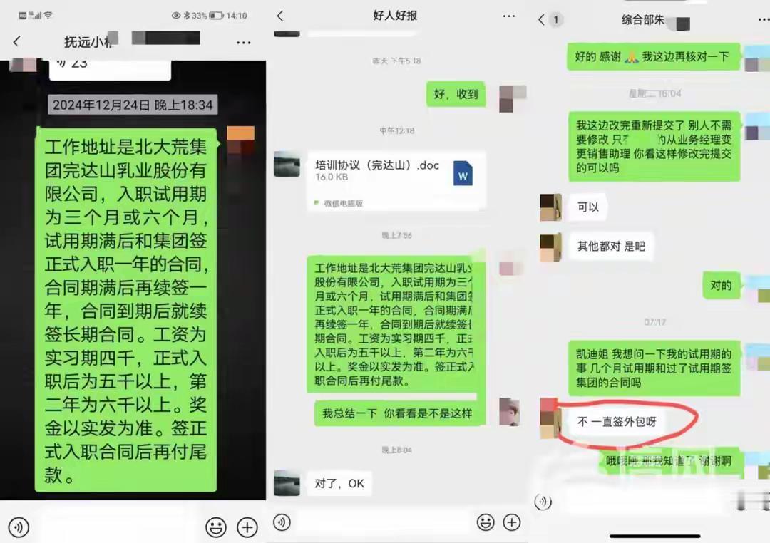 哈尔滨王女士求职遭遇大坑。她正处求职瓶颈,渴望稳定工作,经亲戚层层介绍,加了“抚远小柏”,又通过他认识中介“好人好报”。中介称认识完达山乳业领导,有“内部指标”,交35万就能入职奶粉营销事业部当文员。 王女士交10万定金且通过面试后,却发现要和外地劳务公司签合同,工资也没达到承诺。领导还催她交25万尾款,她拒绝后没几天就被辞退。花大钱买工作,最后落得这般下场,这求职陷阱真是防不胜防啊! 35岁求职困境 求职年龄困境 简历踩坑 求职者陷阱 工作
