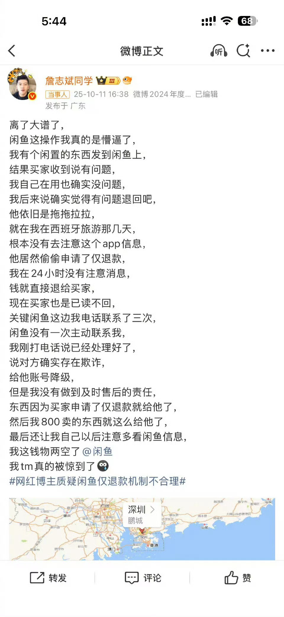 网红博主质疑闲鱼仅退款机制不合理闲鱼平台的烂事儿真不少,机制太不合理了,萌生出很多类似这样的骗子~几年前就被坑过几千块。