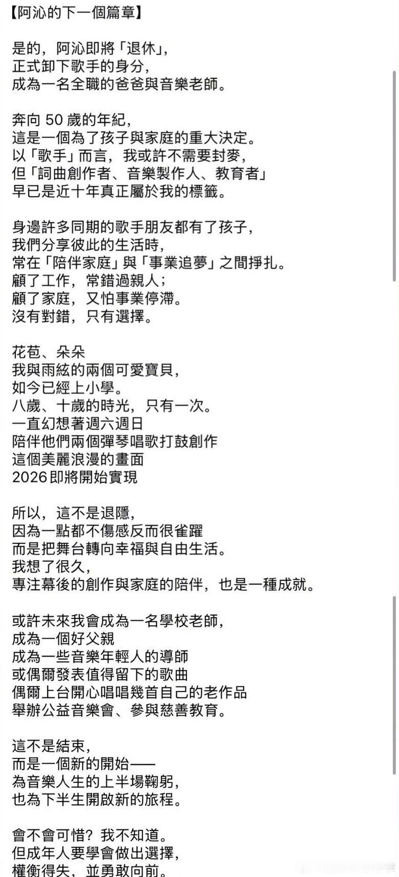 飞儿乐团前成员阿沁宣布退圈,表示自己将正式卸下歌手身份,成为一名全职爸爸和音乐老师,并强调这不是隐 退,而是把舞台转向幸福与自由生活。