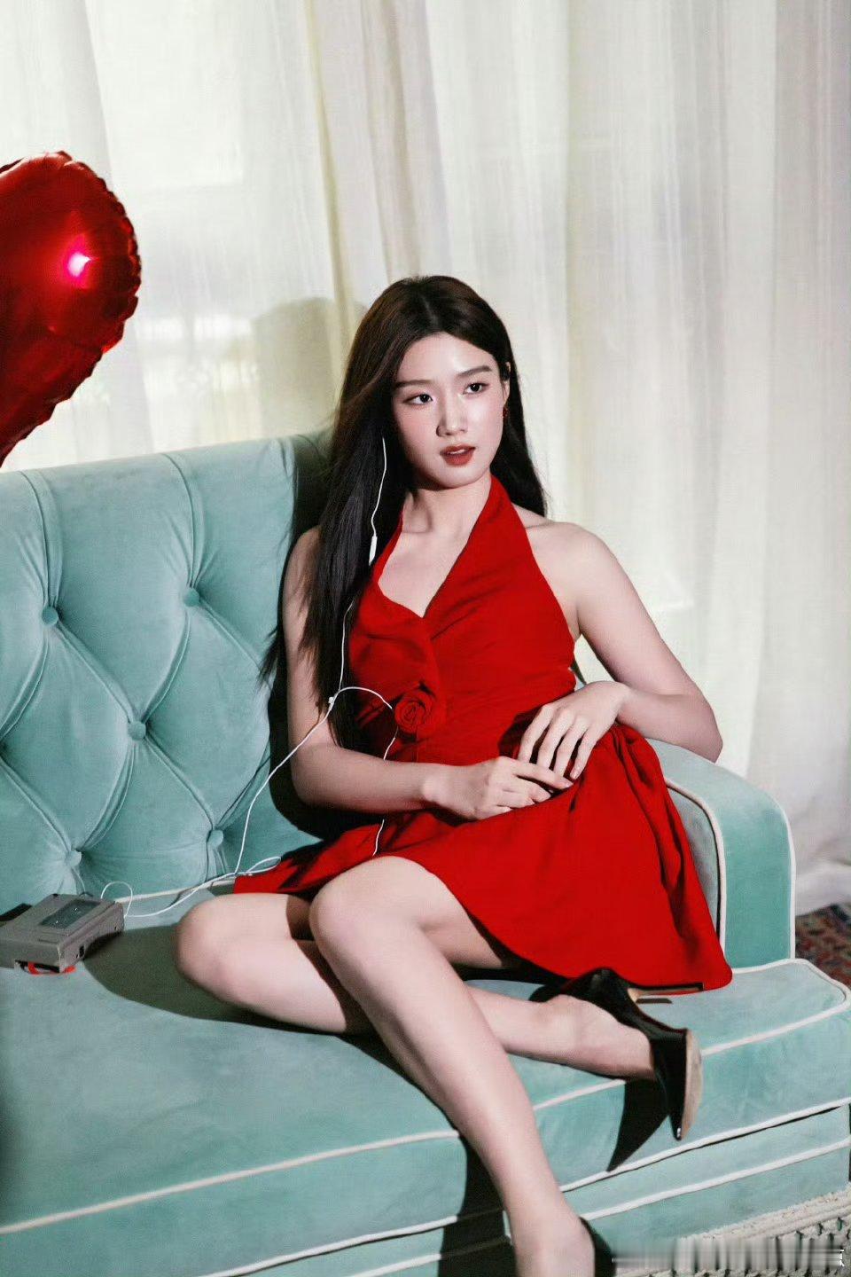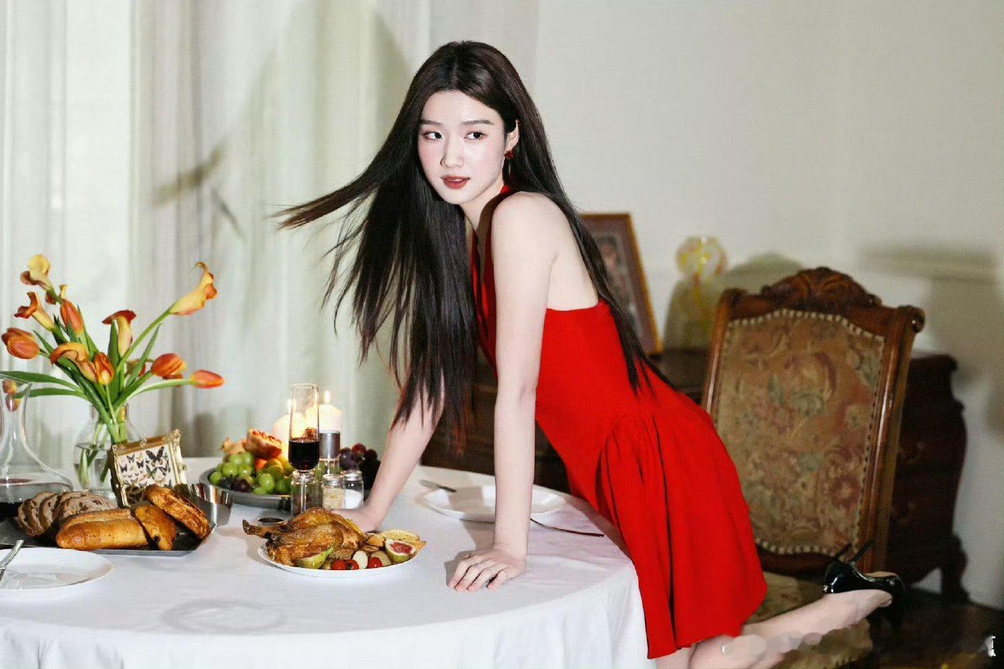 卢昱晓红裙酒红收腰裙超显白,搭珍珠耳饰,文艺又温柔,这氛围感直接拉满​​​