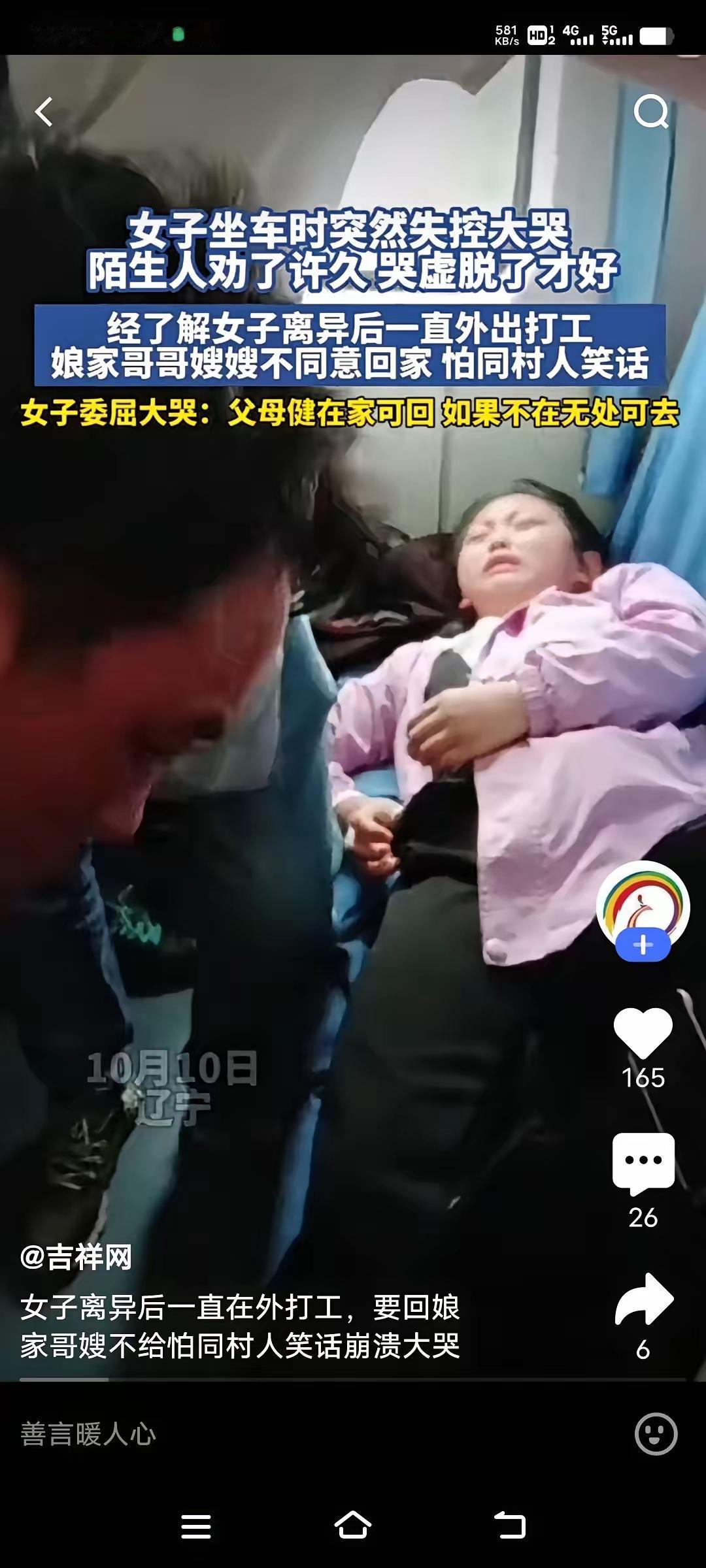 10月10日辽宁的一列列车上,一名女子突然失控大哭,陌生人劝说许久,她哭到虚脱才渐渐平复。原来,这位女子离异后一直外出打工,本想回娘家,却被哥哥嫂嫂以“怕同村人笑话”为由拒绝。她委屈哭喊:“父母健在家可回,如果不在,我便无处可去……” 网友评论: 自己哥嫂都不认你了,你想回的还叫家吗,放弃吧,你哭是哭不回亲情的,坚强点,重新找个好人家度过余生。 这个就是传统习俗规矩让女性结婚了就好好相夫教子,不要动不动以老公满足不了女方的经济需求而离婚而是应该与老公同甘共苦共度难关。 娘家是成长的地方,有亲情温暖,给予离异女性心灵慰藉,这样的哥嫂不可理喻。 就是妹妹可能经济条件差点,如果有钱,她哥嫂就不会这样对待她,巴结她还来不及,现在社会就是那么现实,没钱就没有亲情。