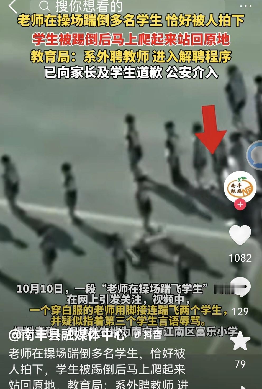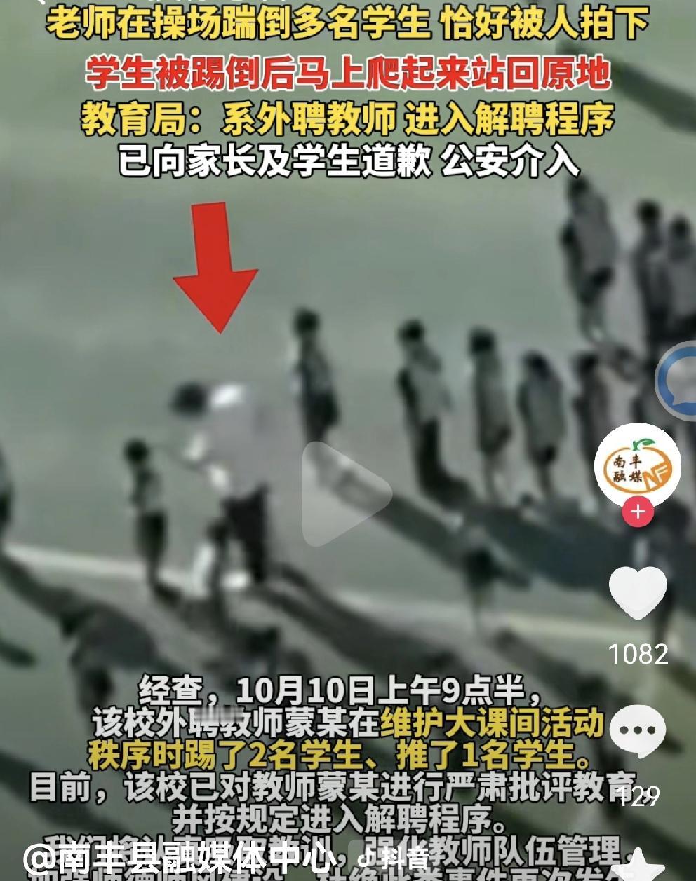 老师操场踹几名小学生,师德碎了一地 10月10日,南宁市某小学大课间 一名穿白衣服的老师,迈着六亲不认的步伐,在学生队伍里巡视。 突然,抬起脚踹一名学生,孩子倒地后站起来;老师继续前行,飞起一脚踹倒第二个孩子;接下来走到后面那个孩子跟前,指指点点… 教育局通报: 老师是外聘的,已经解聘! 已向家长道歉,公安介入。 视频很短,只拍到这三个孩子。 就事论事说: 这老师五大三粗,站在小学生面前,就是一座铁塔🗼学生都害怕 孩子站的好好的,飞起脚就踹,这哪里是老师,简直就是小混混闯进校园作恶。 这个老师,霸道惯了吧。 当着全校学生的面,面对校园360℃无死角的摄像头,说踢就踢,说骂就骂… 这踢的是学生,踩碎的是老师的师德! 外聘老师 ,也是老师!这样素质的老师能应聘教书,校长把关不严,难辞其咎! 希望,两个被踹的孩子没有留下心里阴影! 南宁教师打学生