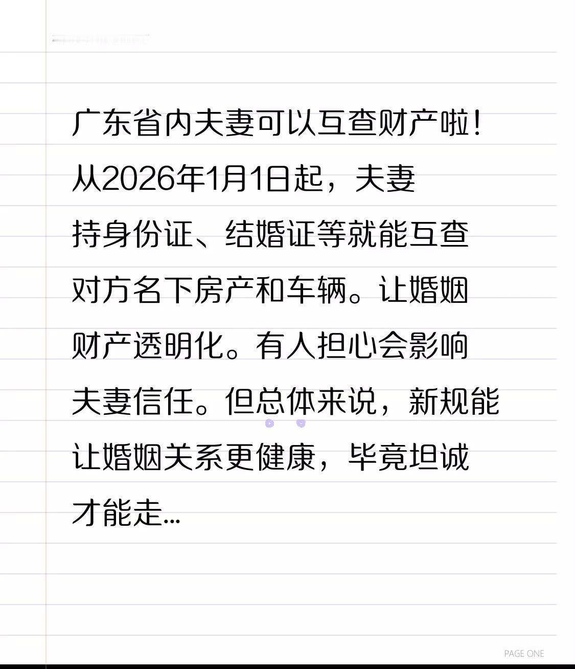 广东省内夫妻可以互查财产啦!从2026年1月1日起,夫妻持身份证、结婚证等就能互查对方名下房产和车辆。让婚姻财产透明化。有人担心会影响夫妻信任。但总体来说,新规能让婚姻关系更健康,毕竟坦诚才能走得长远嘛。