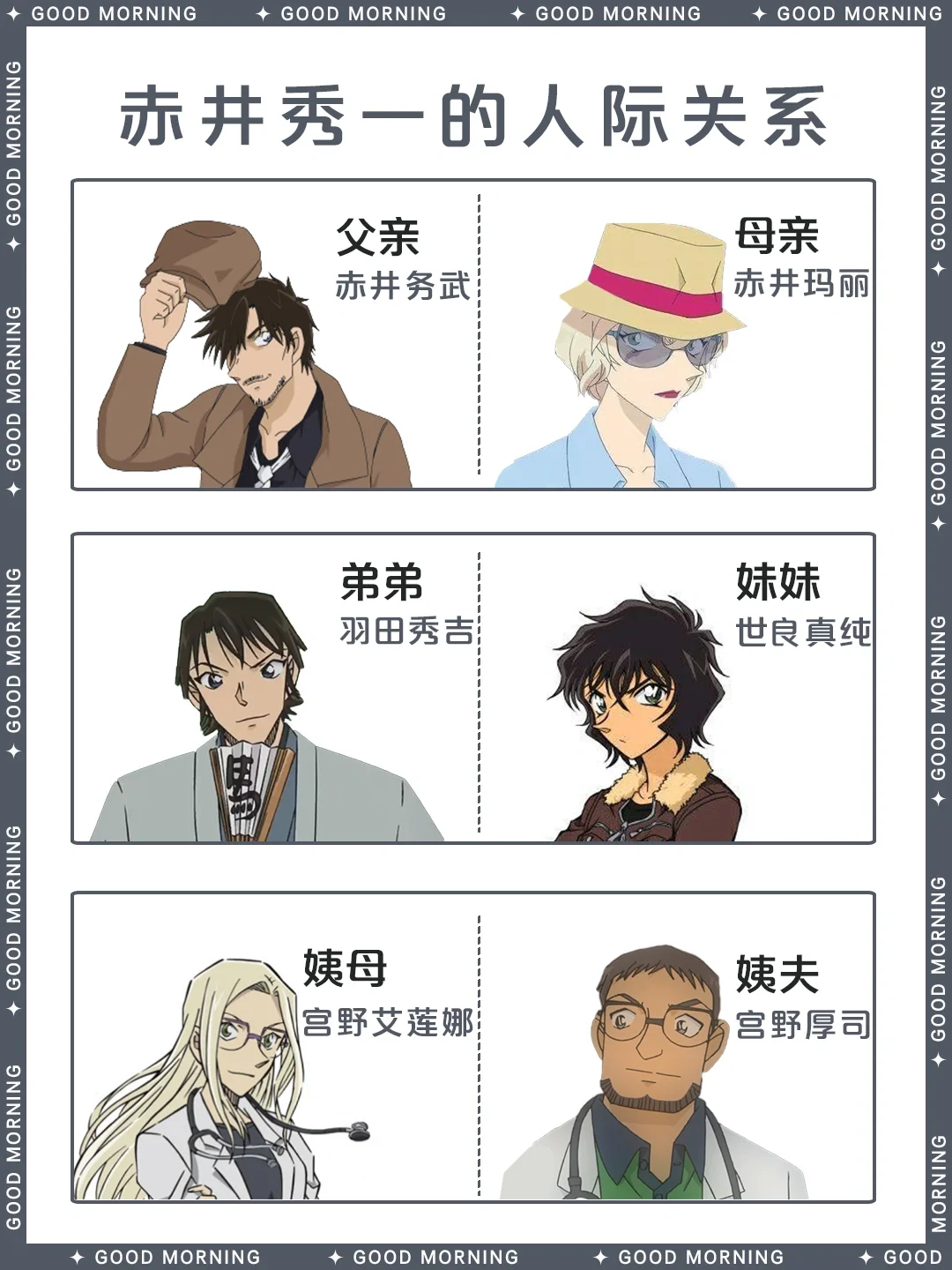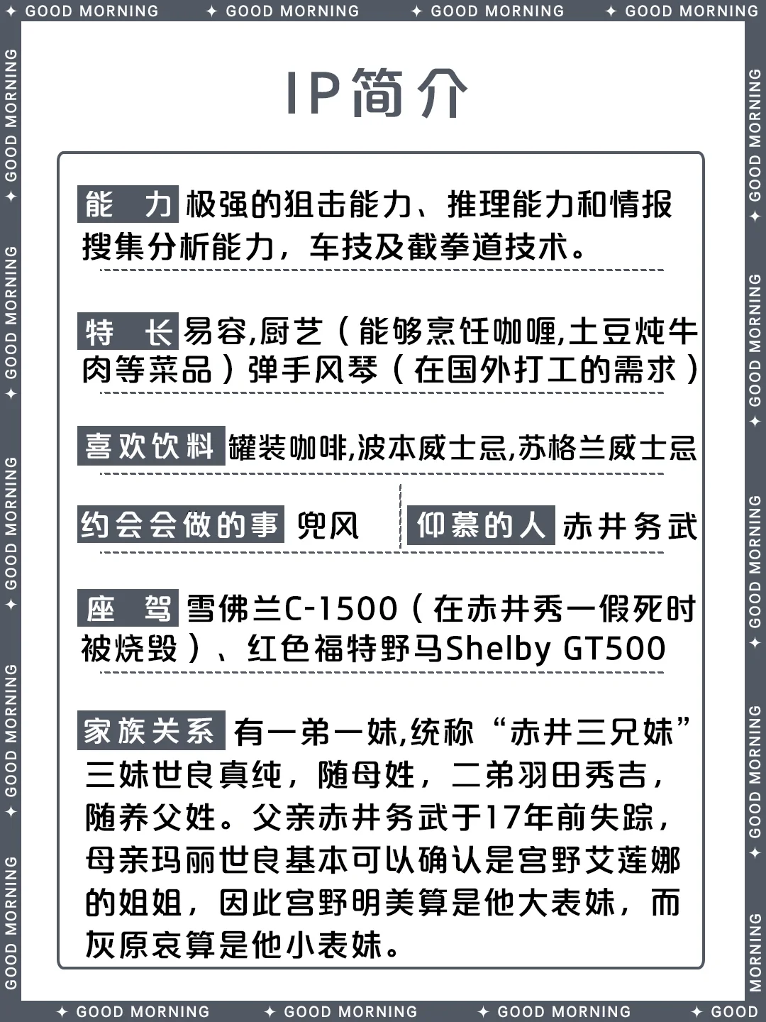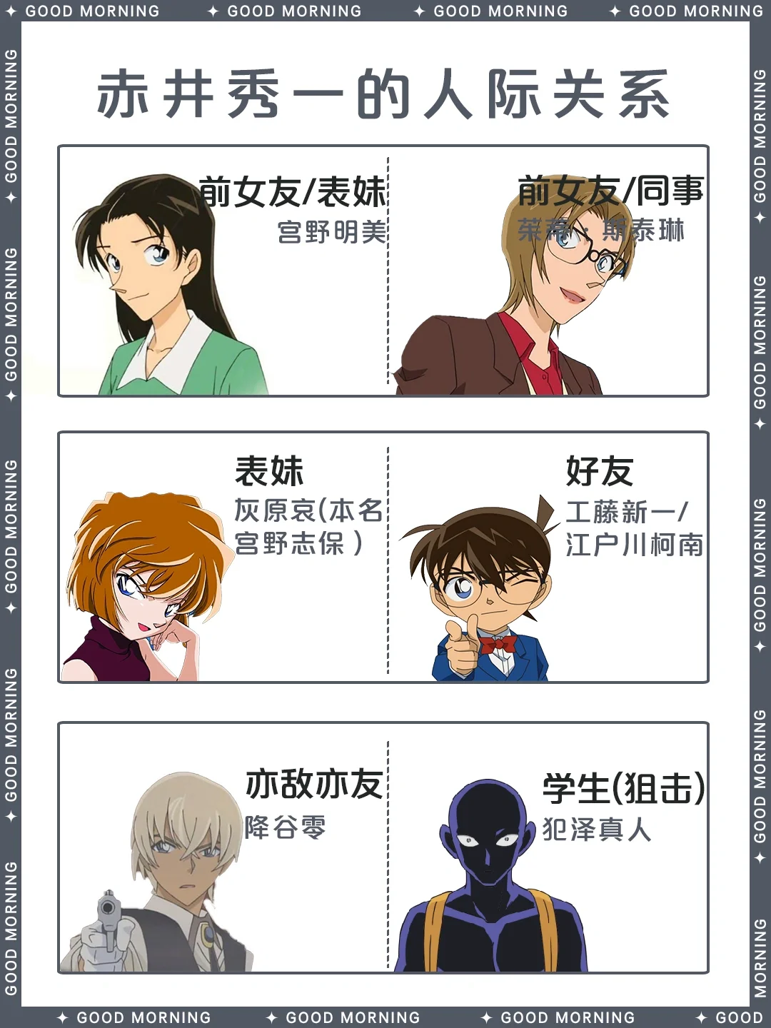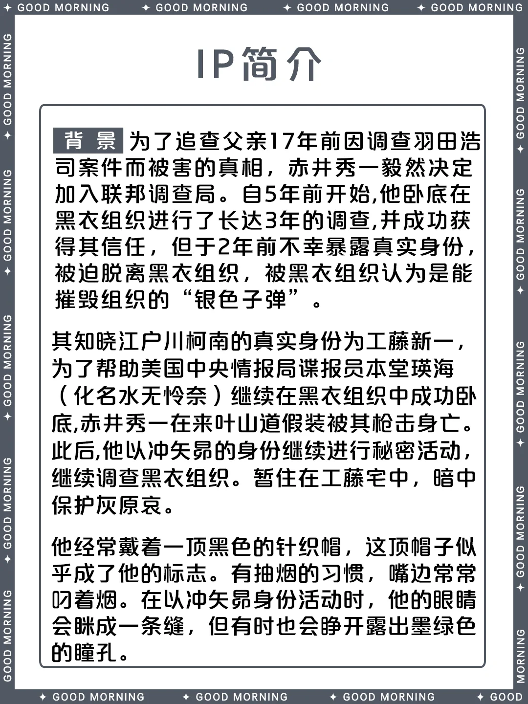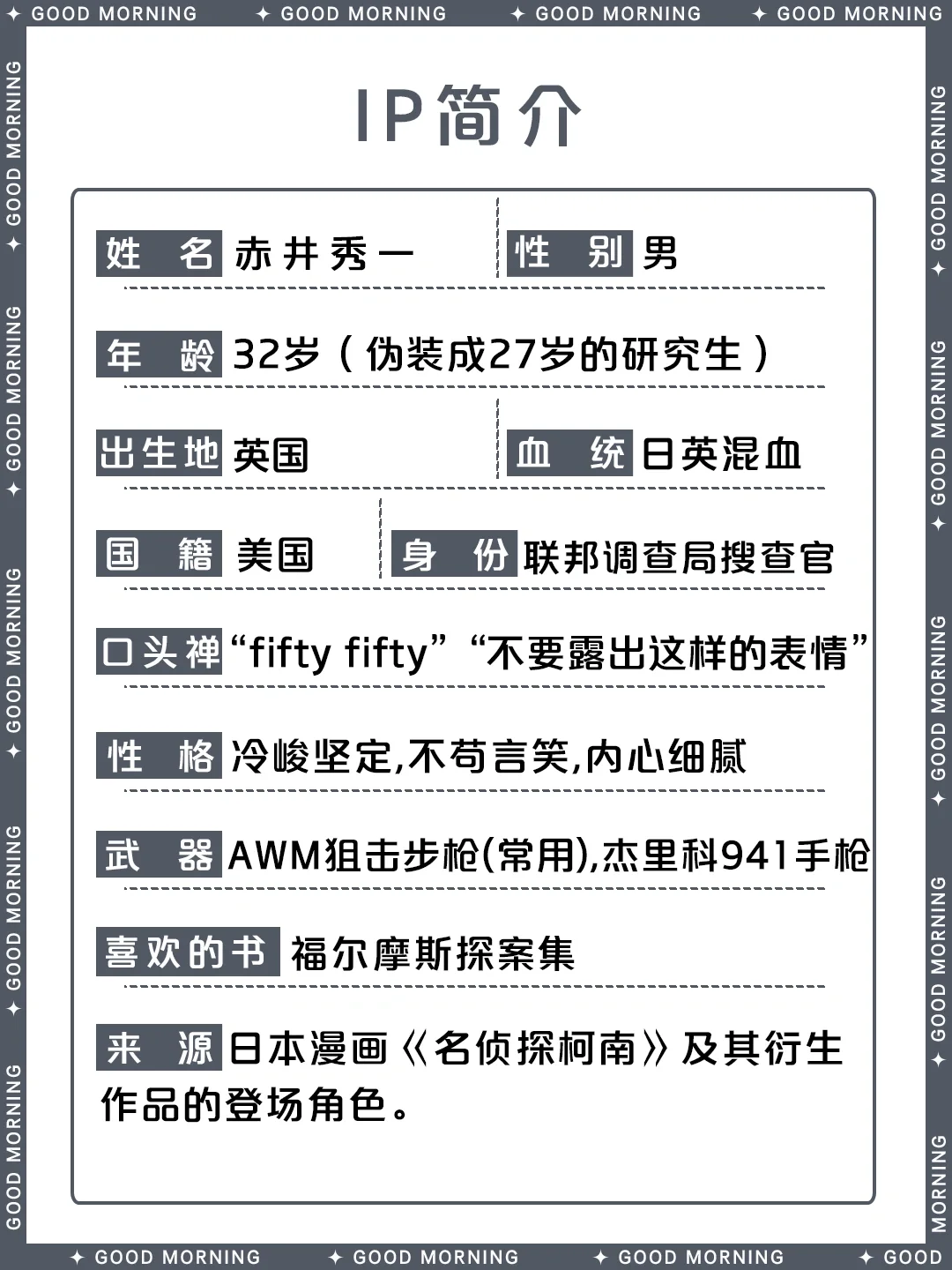 别 名:諸星大、黑麦威士忌/莱伊、冲矢昴、秀哥、赤井先生、秀、银色子弹、阿卡伊