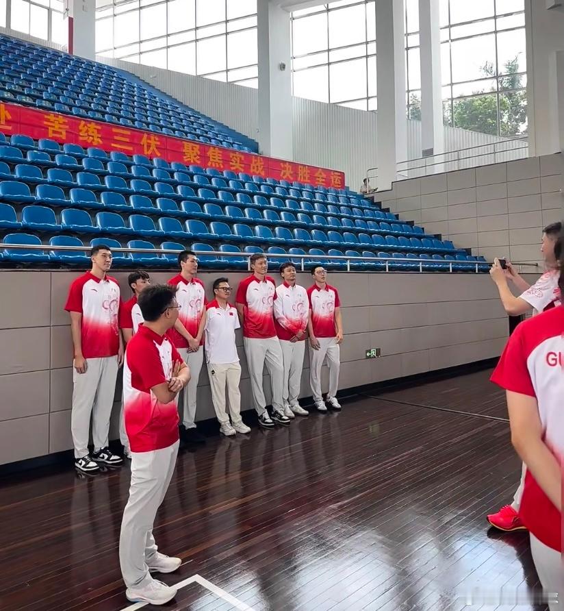 哥几个穿上广东队队服啦[酷],红白配色的polo衫,杜导还化身摄影师给大家合影留念,期待即将到来的全运会!