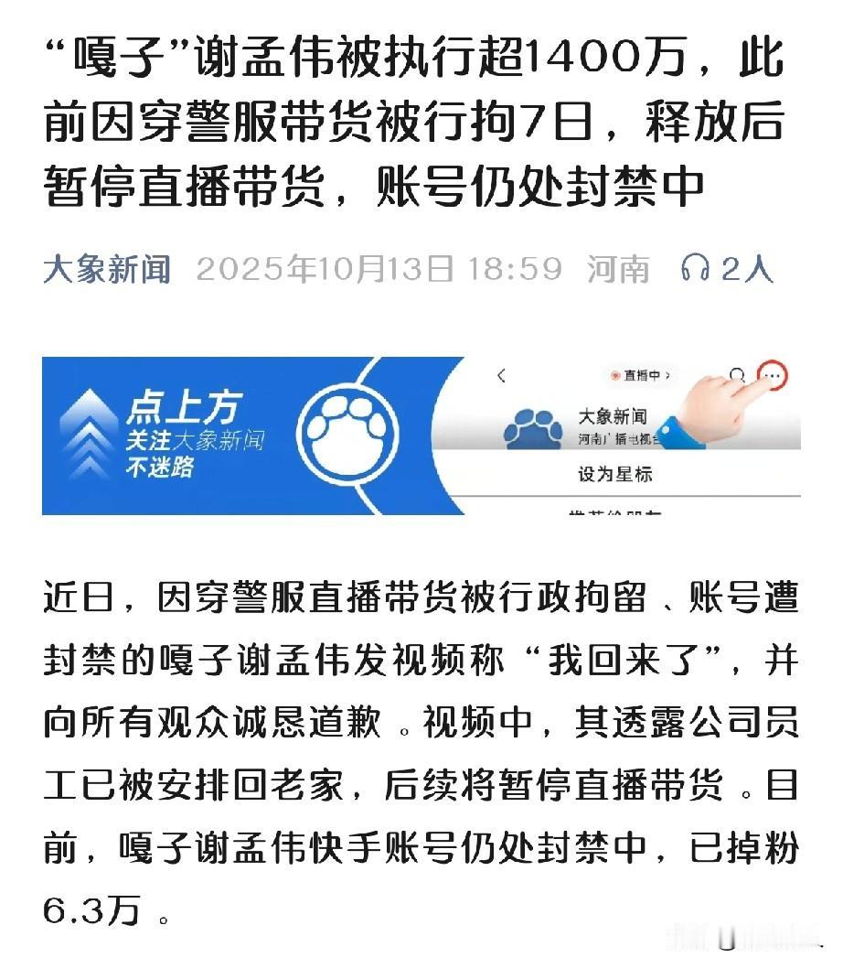 “嘎子”被执行超1400万 这次真的可能要凉凉了 又被爆出新增2条被执行信息 : →被执行金额 : 210万 被执行人:嘎子夫妇 执行法院:邵阳市新邵县人民法院 →被恢复执行金额:500万元 被执行人:嘎子、郭珊珊、林某某、祖某某 执行法院:北京市大兴区人民法院 而在这之前,就已经存在有几条被执行信息: →被执行金额:约524万元; 被执行人:嘎子、祖某某 执行法院:濮阳市华龙区人民法院 →被执行金额:约171万元,并被限制高消费。 被执行人:嘎子 执行法院:郑州市管城回族区人民法院 以上合计被执行金额共超1400万 嘎子,进去呆了7天,账号被封,直播带货搞不了了,演员职业生涯堪忧,现在又来这一波被执行信息😂😂 所以说,做人做事要规规矩矩,高位和财富,从来都是有德者才能把握得住,任何时候都要记住“厚德,才能载物”。 网络也不是法外之地,维护网络环境的清净、安全,人人有责! (信息来源:大象新闻)