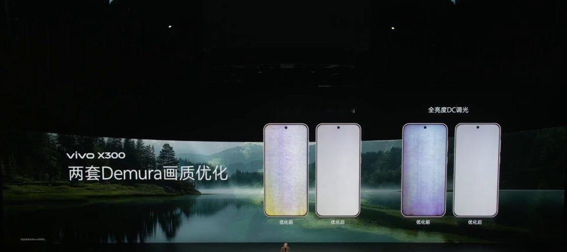 vivo X300 采用一块 6.31 英寸 2640×1216 OLED 直屏,京东方 Q10 plus 发光材料,局部峰值亮度 4500nit,最暗 1nit,支持 120Hz 刷新率,8T LTPO(1-120Hz),2160Hz 高频 PWM 调光+全亮度类 DC 调光,全链路蔡司自然色彩