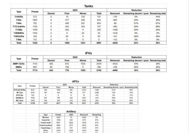 俄军4400辆坦克消失,俄罗斯高估了苏联遗产。开源情报显示,俄罗斯自2022年俄乌冲突爆发以来,已从其战前的7300辆坦克库存中调出超过4400辆,目前仅剩不到2900辆在库。现存坦克中只有约23%处于可用或良好状态,大量老旧型号如T62、T55乃至T54正被重新焊接上阵。 说起俄乌冲突打到现在,俄罗斯的坦克库存这事儿真让人觉得有点儿讽刺。开战前,俄罗斯号称有7300多辆坦克储备,看起来挺壮观,全是苏联时代攒下的家底儿。可三年下来,开源情报一扒拉,超过4400辆已经被拉出去用,现在库里就剩不到2900辆了。这数字不是随便说说的,根据Defence 24基于OSINT数据的分析,战前战略储备有7342辆主战坦克,到现在只剩2792辆,撤出的有4931辆。其他类型装甲车也差不多,BMP步兵战车从7100多辆掉到2579辆,装甲运兵车从11000多辆缩水到5000辆左右。火炮系统损失更是过半,简直是库存大出血。 这事儿的核心,就在于俄罗斯一开始太高估苏联留下的遗产了。苏联解体后,俄罗斯继承了海量的老装备,坦克堆得像山一样,以为随时能拉出来顶上。可现实骨感,这些东西搁那儿闲置三十多年,早不是新鲜货了。Oryx的统计显示,到2025年9月,俄罗斯确认损失的坦克已经超过3600辆,加上损坏的200多辆,总数逼近4000大关。这还不算没拍到照片的隐形损失。ISW的报告也直指,俄罗斯靠着苏联库存勉强维持攻势,但这些老坦克质量堪忧,只有23%左右能直接上阵用,其余的得大修小补才能动弹。T-62、T-55、T-54这些冷战老古董,本来是博物馆级别,现在却被焊焊补补扔到前线,简直是饮鸩止渴。 为啥会这样?先说数量。苏联时代坦克产量惊人,T-54/55系列就造了上万辆,T-62也有几千辆。俄罗斯以为这些储备能撑很久,谁知战场消耗速度超乎想象。WarSpotting的OSINT数据显示,俄罗斯总损失装备超过2万件,坦克占了3600多。乌克兰用无人机、精确炮弹和反坦克导弹,专挑这些铁疙瘩下手。一辆坦克上前线,没几天就成废铁,补给跟不上,库存自然见底。2024年俄罗斯损失了1400多辆主战坦克,2025年上半年又丢了上千辆。IISS的评估说,俄罗斯装甲部队的损耗率高得吓人,远超生产能力。 再说质量问题,这才是致命的。那些封存坦克大多露天搁置,锈迹斑斑,引擎、电子系统全得重做。The Insider的报道指出,修一辆能打的T-62,往往得拆两三辆报废的T-80当零件。维修厂技术落后,质量控制差,修出来的东西火控容易失灵,乘员安全也没保障。现代战争里,坦克不再是无敌主角,早被无人机和制导武器盯上。俄罗斯的T-72B库存从1478辆降到292辆,T-80系列储备彻底抽干。卫星图像显示,莫斯科周边几乎没剩可用库存了。俄罗斯工业体系也跟不上,乌拉尔车厢厂一年顶多产200-300辆新坦克,远低于损失。CSIS的分析说,自2022年2月起,俄罗斯损失坦克超3000辆,已经吃掉战前现役库存,还得靠老货续命。 这高估遗产的毛病,还表现在战略误判上。普京一开始以为速战速决,坦克洪流就能碾过去,结果陷入消耗战。ISW的10月8日评估指出,俄罗斯赌的是能熬过乌克兰和西方的支持,可库存耗尽后,进攻势头就弱了。2025年俄罗斯推进了206平方英里土地,但付出的代价是装备堆积如山。Reddit上的CredibleDefense讨论也提到,俄罗斯坦克部队组成越来越杂,Vuhledar进攻时用了7种不同型号,数量还少,说明储备链条快断了。乌克兰这边聪明多了,靠西方援助和缴获装备,损失才7600件,装甲车才3800辆,远低于俄罗斯的2万多。 长远看,这问题不小。俄罗斯的装甲力量进入榨干阶段,T-62和T-55的翻修耗尽了最后的技术储备。Dagens的OSINT分析说,仓库里1300多辆状况差的坦克,1100辆彻底没法修。生产线上,T-90M组装慢,供应链断断续续,进口部件延误常见。战场上,这些老坦克履带易脱,推进卡壳,成了活靶子。Euromaidan Press报道,俄罗斯战略储备只剩35%的坦克,36%的步兵战车,45%的装甲运兵车。火炮也剩39%。 总的来说,这场仗暴露了俄罗斯军工的软肋。苏联遗产数量是多,但质量和可持续性差远了。开战头一年还能靠库存快速补位,现在只能翻文物上阵。国际事件上,得承认这不是简单数字游戏,牵扯到地缘博弈和军备竞赛。西方援助让乌克兰稳住阵脚,俄罗斯的消耗战打得吃力。未来几个月, 库存继续缩水,俄罗斯进攻能力会进一步受限。Oryx和ISW的持续追踪显示,俄罗斯坦克损失已超4000辆,比战前现役多1000辆。俄罗斯得想想怎么破局,不然遗产再多也扛不住现实的锤子。