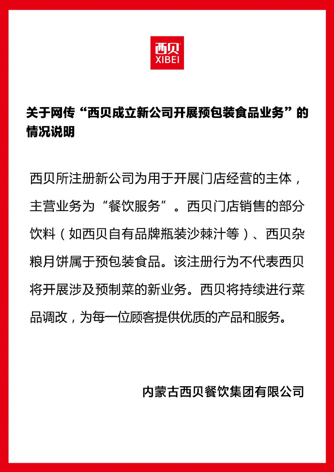 【#西贝回应成立新公司卖预包装食品#:不代表开展涉及预制菜的新业务】#西贝回应成立新公司卖预制菜# 10月13日,西贝集团发布的关于网传“西贝成立新公司开展预包装食品业务”的情况说明指出,西贝所注册新公司为用于开展门店经营的主体主营业务为“餐饮服务”。西贝门店销售的部分饮料(如西贝自有品牌瓶装沙棘汁等)、西贝杂粮月饼属于预包装食品。该注册行为不代表西贝将开展涉及预制菜的新业务。西贝将持续进行菜品调改,为每一位顾客提供优质的产品和服务。