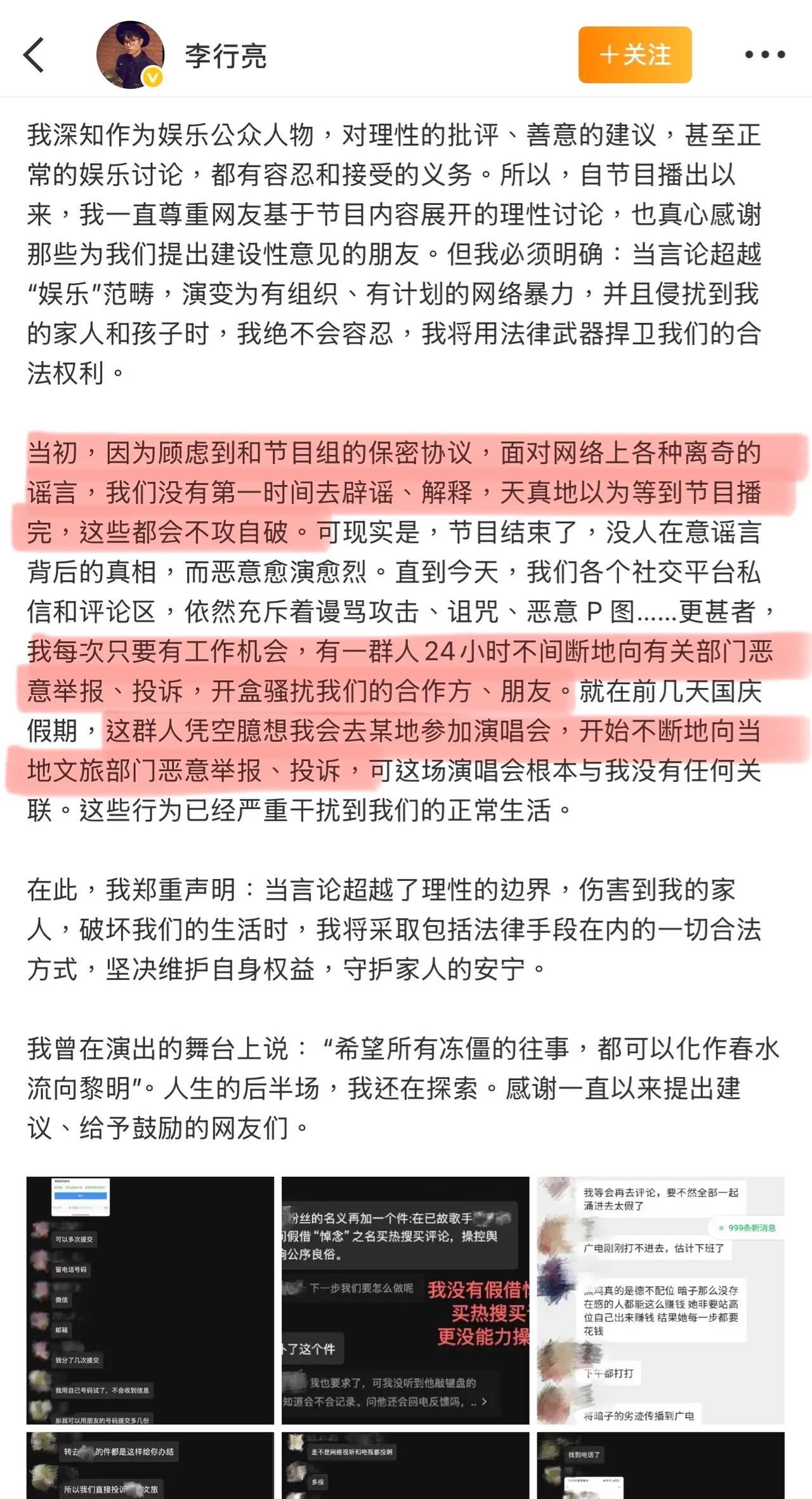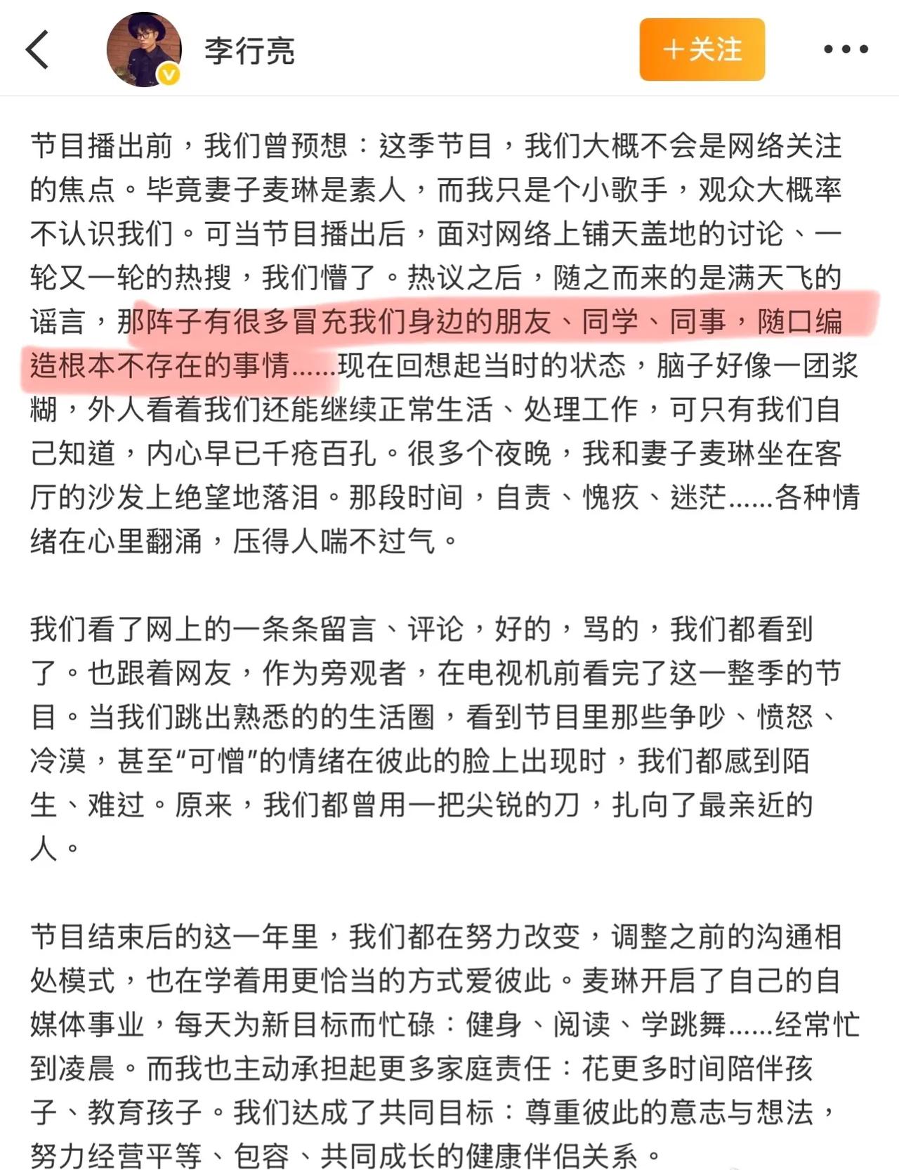 《再见爱人》给李行亮麦琳夫妇带来的影响不是一般大,不仅节目播出时被骂惨了,节目播完后李行亮称只要有工作机会就会被投诉。 李行亮说和麦琳参加《再见爱人》遭受了不少谣言和网.暴,因为顾虑到和节目组的保.密.协.议就没有去辟谣,没想到直到今天两人各个社交平台依然充斥着谩骂和攻.击。李行亮每次只要有工作机会,有一群人24小时不间断地向有关部门恶.意.举.报。甚至跟李行亮没有任何关联的演唱会,这群人也会凭空臆想李行亮会去参加。 “现在回想起当时的状态,脑子好像一团浆糊,外人看着我们还能继续正常生活、处理工作,可只有我们自己知道,内心早已千疮百孔。很多个夜晚,我和妻子麦琳坐在客厅的沙发上绝望地落泪。那段时间,自责、愧疚、迷茫……各种情绪在心里翻涌,压得人喘不过气。 节目结束后的这一年里,我们都在努力改变,调整之前的沟通相处模式,也在学着用更恰当的方式爱彼此。但我必须明确:当言论超越“娱乐”范畴,演变为有组织、有计划的网络暴力,并且侵扰到我的家人和孩子时,我绝不会容忍,我将用法律武器捍卫我们的合法权利。” 有一说一李行亮真的惨,网友是不是有点过了,看完节目感觉他们两个的问题也不是多大,只是被放大了而已,观众太入戏了。 之前还在可怜李行亮,现在又来抵制他,伤害他的家人,可是最后还是麦琳陪在他身边,人家才是夫妻,相互扶持的人,网友真没必要生那么大气。 首先,生活是他们的,选择权也在他们手上,只看了他们一些争执片段,就判定他俩必须要离婚,他们日常的幸福片段咋不去分析呢?本来就是一个观察类综艺,见贤思齐,见不贤而内自省,实在不喜欢,当个乐子看也就算了。大家对综艺还是不要太入戏了。
