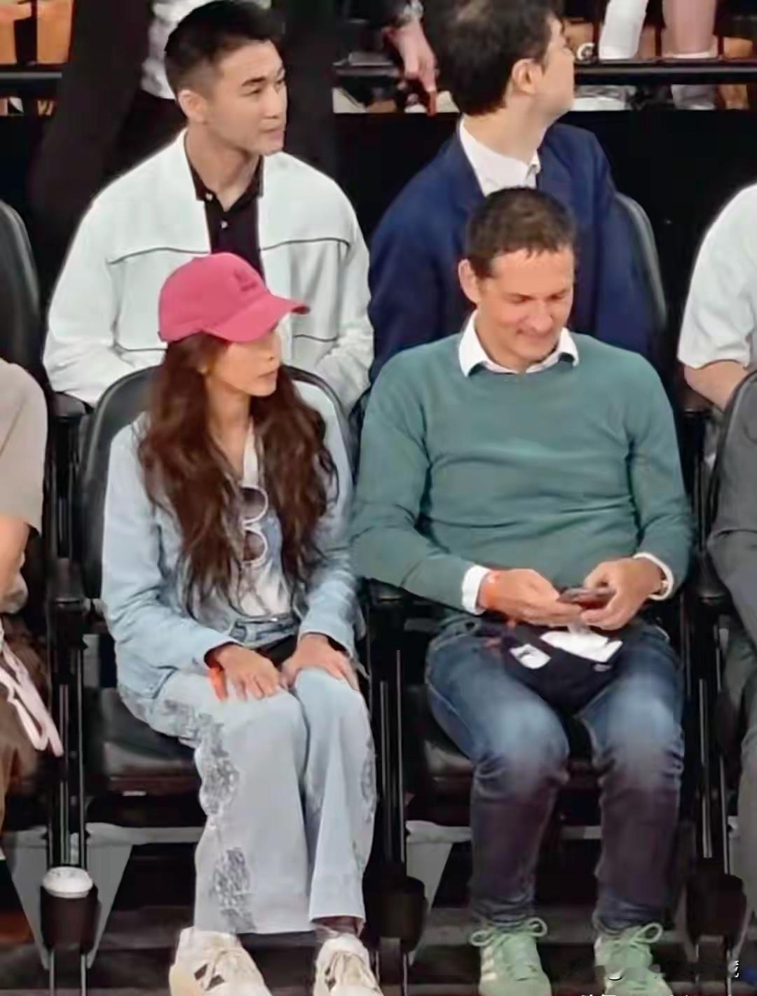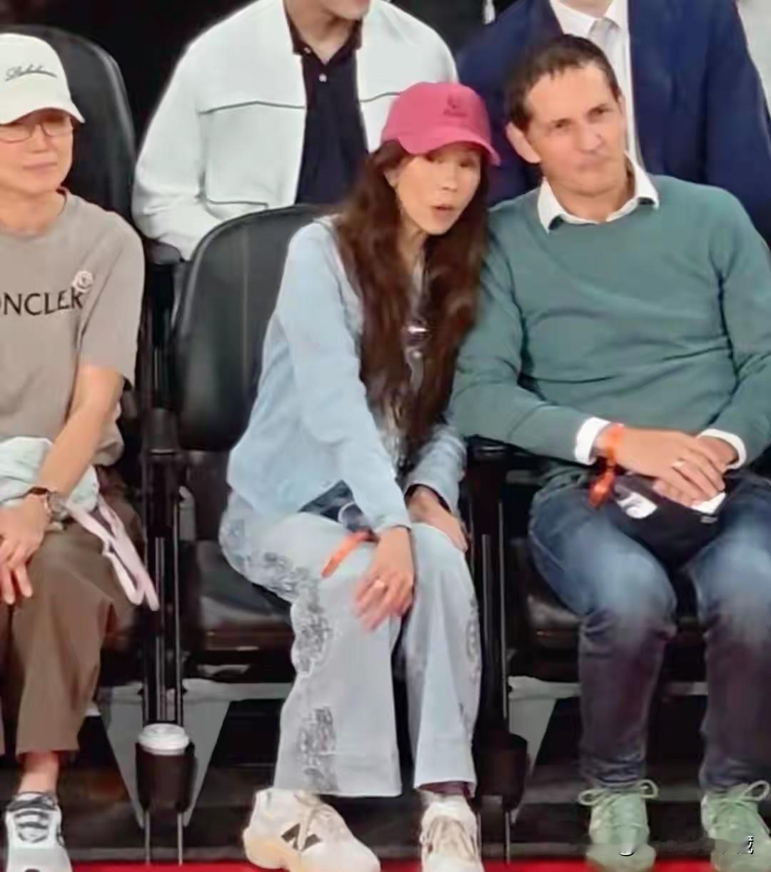 莫文蔚和外籍老公去澳门观看篮球赛,外籍老公高大时尚,眼睛深邃,有些像乒乓名将波尔的样子,绿色毛衣配蓝色牛仔裤,绿色系运动鞋,这浅绿色鞋子还真的少见,可见莫文蔚老公很懂得衣服搭配,二人身后是赌王何鸿燊的公子何猷君,坐在二人身后,做了二夫妻俩的背影墙!