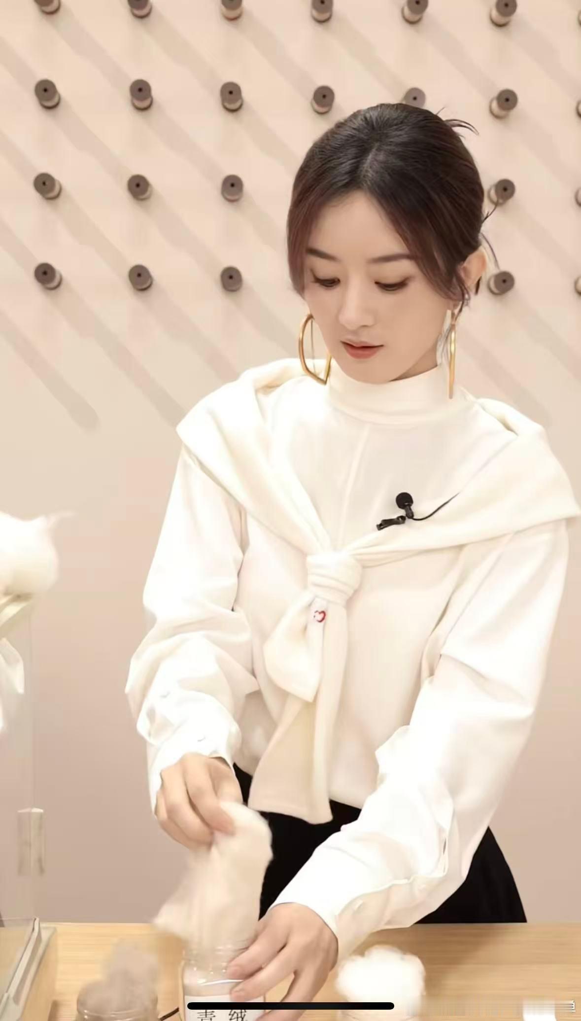 赵丽颖直播状态 谁懂啊!赵丽颖今天直播状态也太好了吧!白色衬衫裙版型超正,腰间的腰带刚好勾勒出腰线,走路带风超有气质。珍珠项链细细一条,衬得颈部线条超好看。直播中她认真讲解羊绒面料的优点,还亲手触摸展示质感,专业又亲切,每一帧都像精心拍的写真~