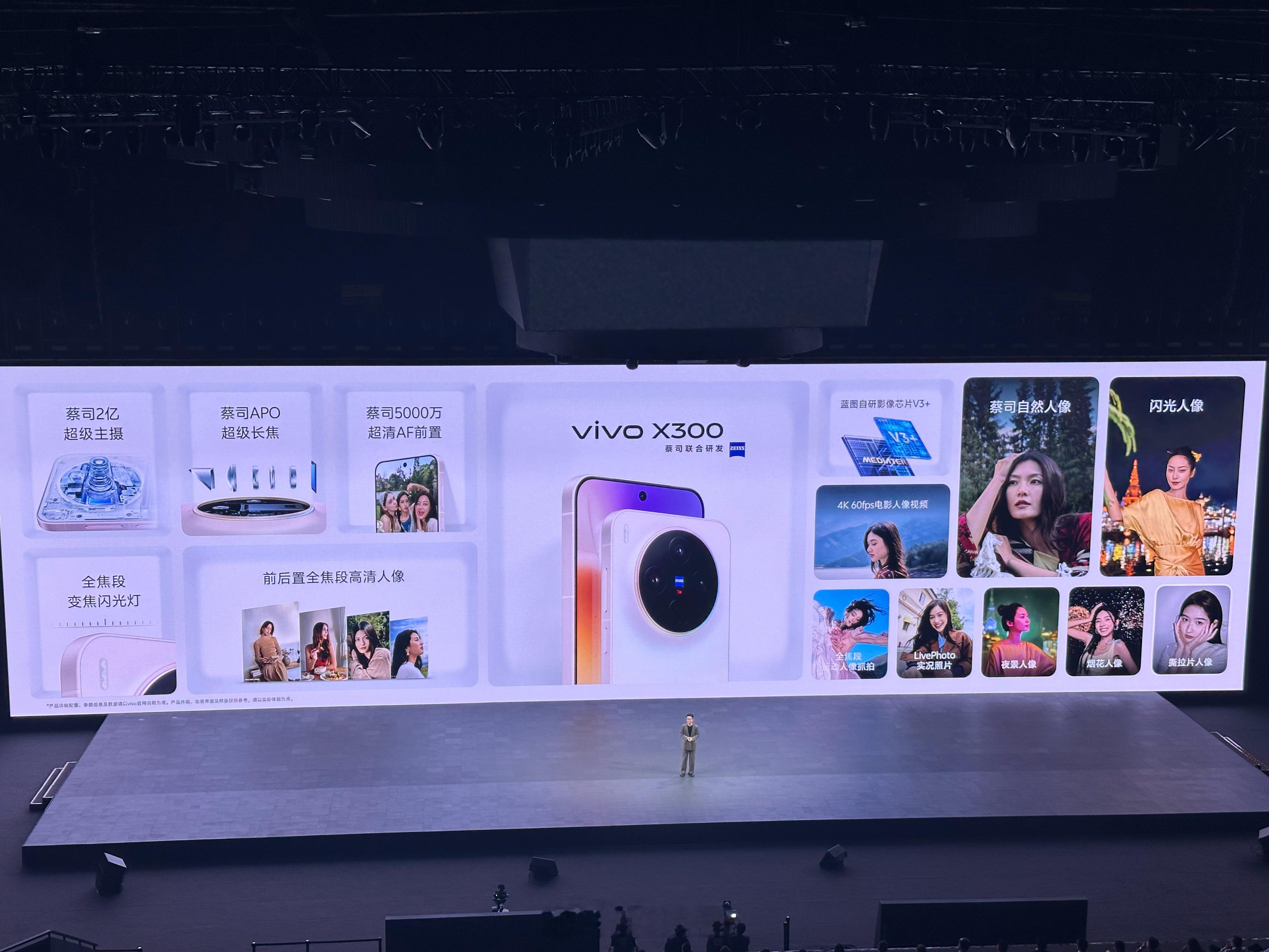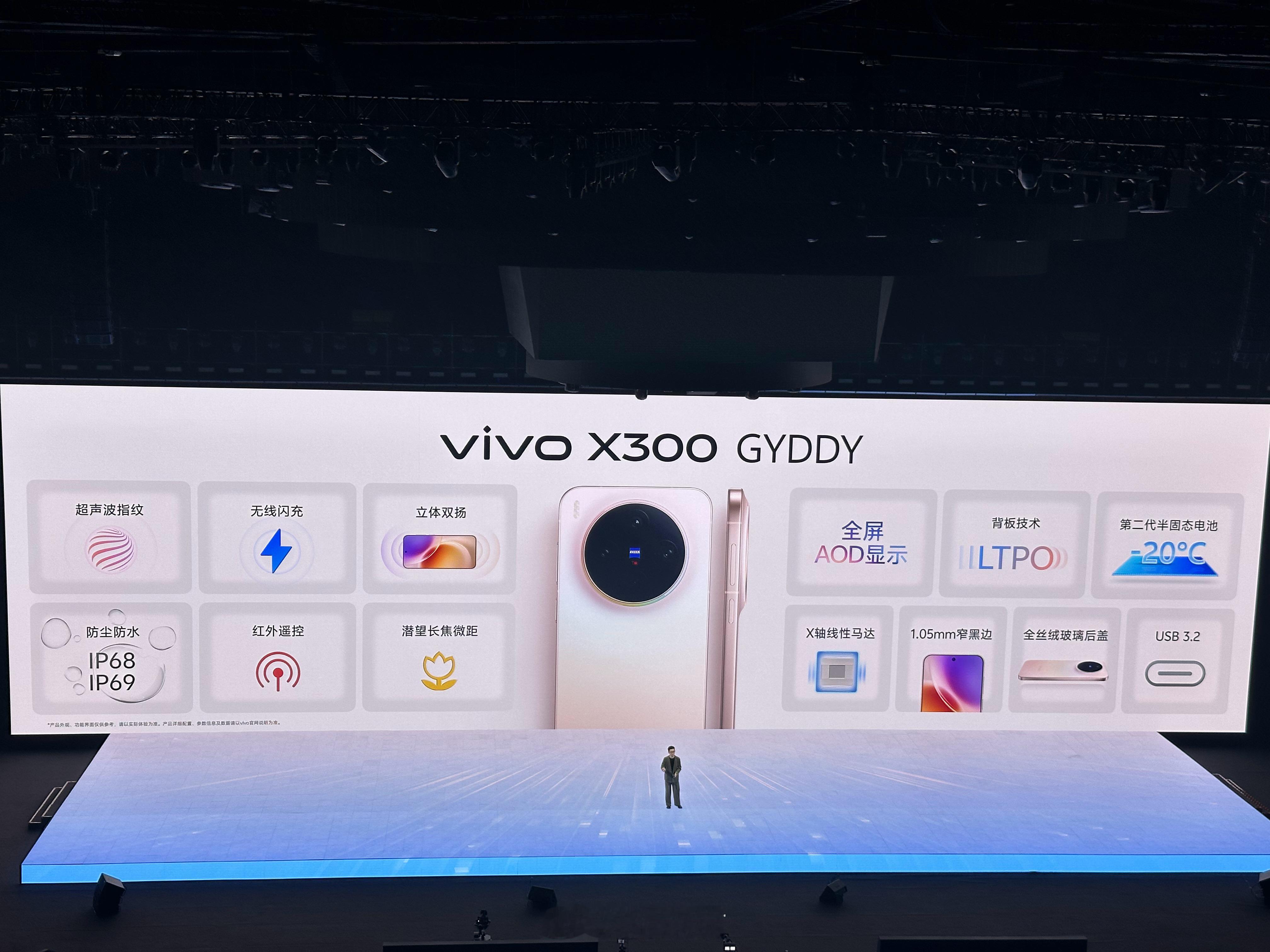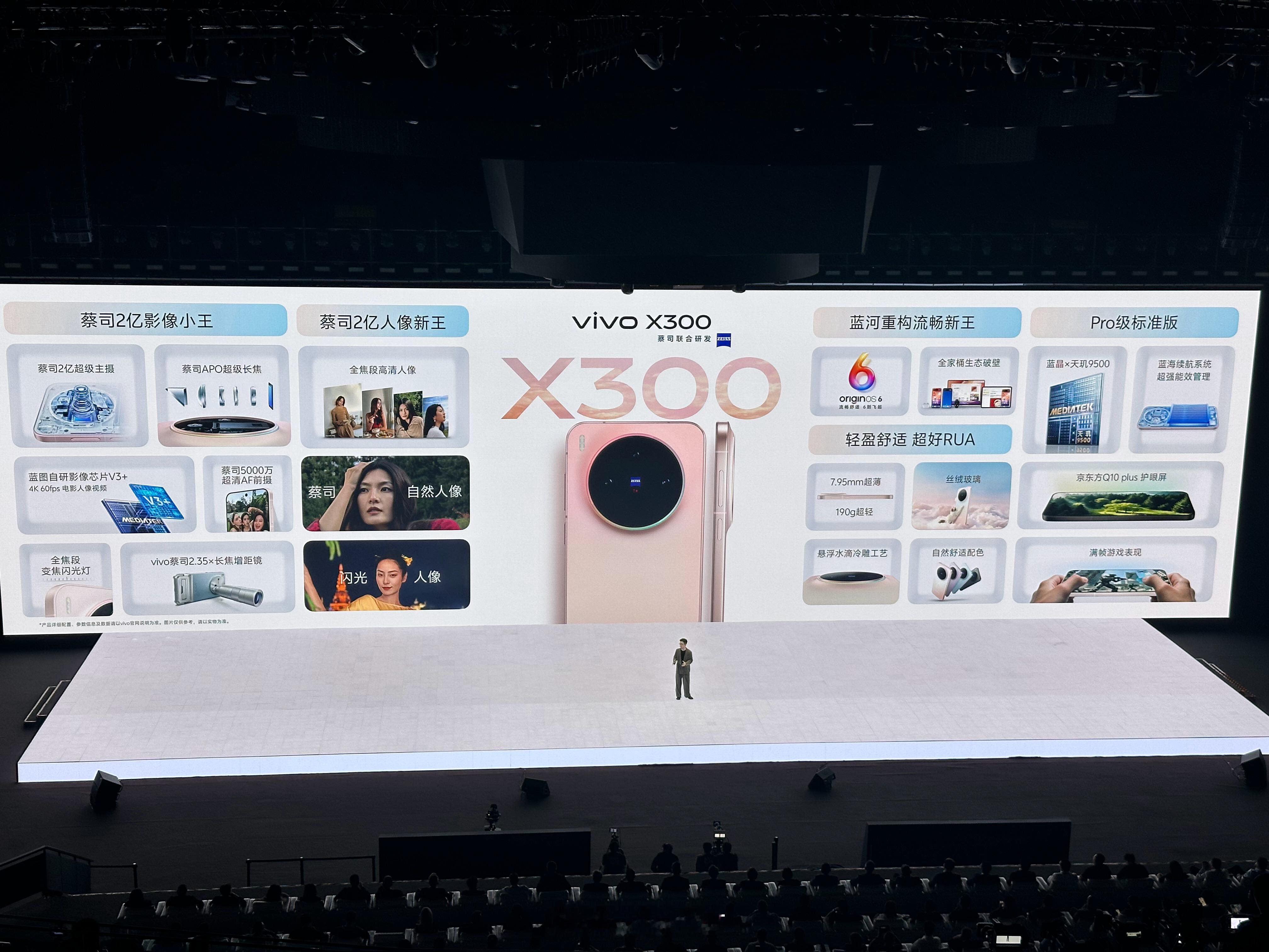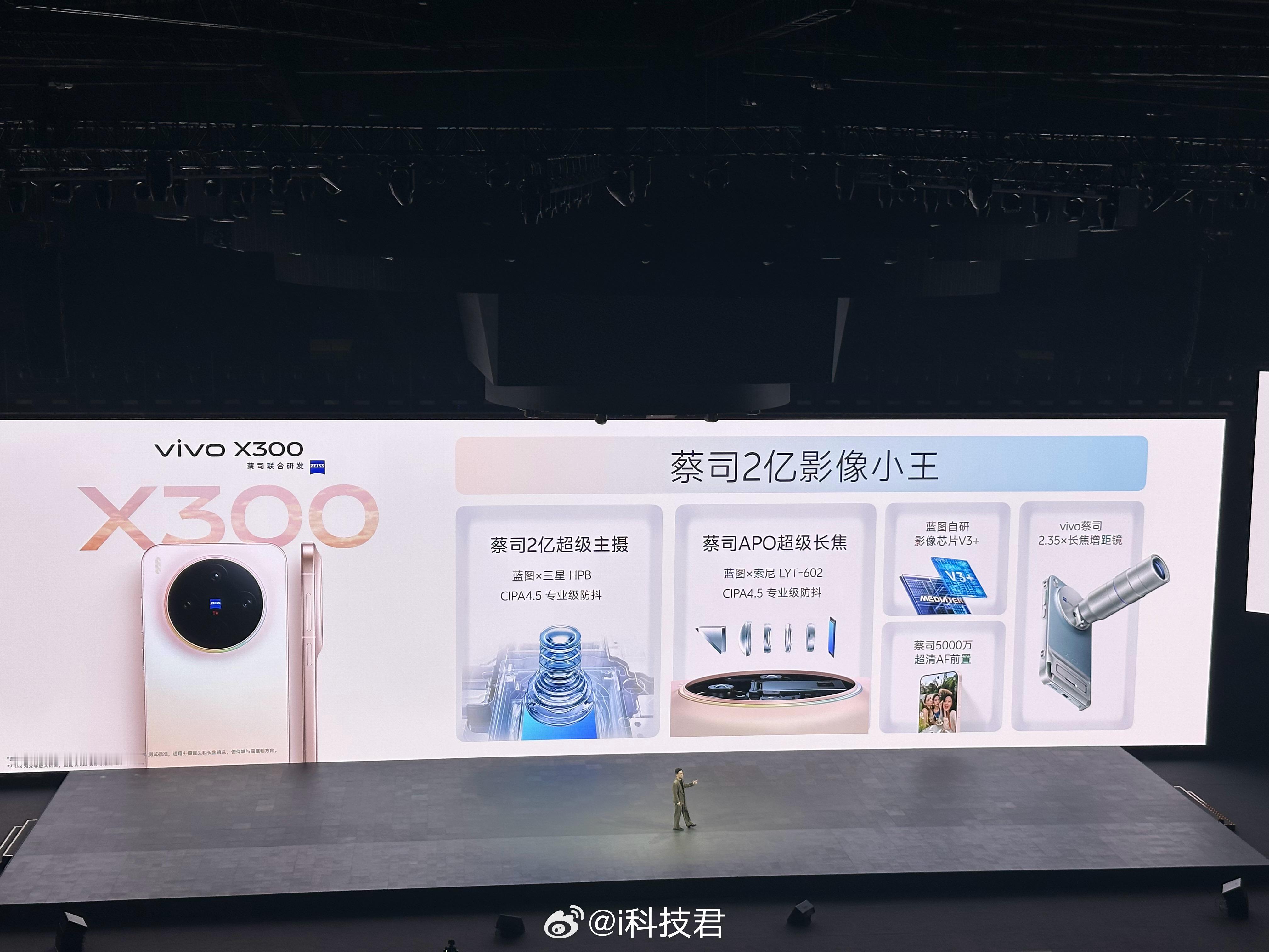 X300标准版还有前置5000万镜头,2亿主摄HPB,蔡司APO长焦LYT-602,全焦段5000万像素,全焦段变焦闪光灯,4K 60fps电影人像视频,超声波指纹,无线闪充,红外遥控,IP68和IP68防尘防水,厚7.95mm,重190克……vivo x300系列