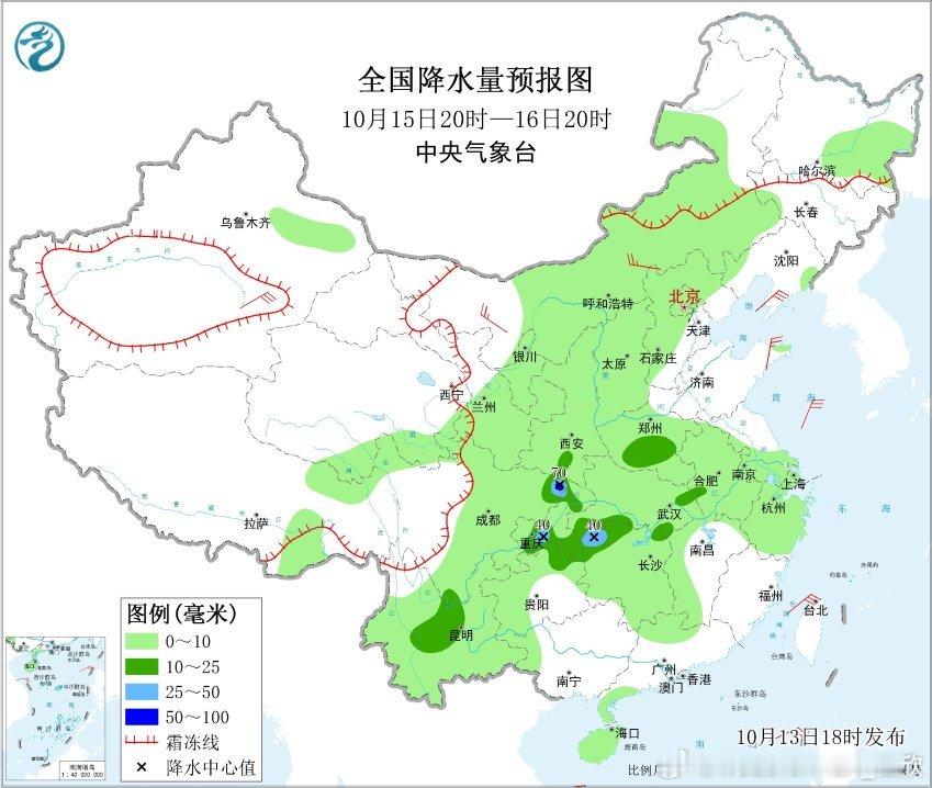 10月15日20时至16日20时,河南中部、湖北东部和南部、湖南北部、陕西南部、四川东北部、重庆南部、贵州北部、云南中部等地部分地区有中到大雨,其中,四川盆地东北部局部地区有暴雨(50~70毫米)。