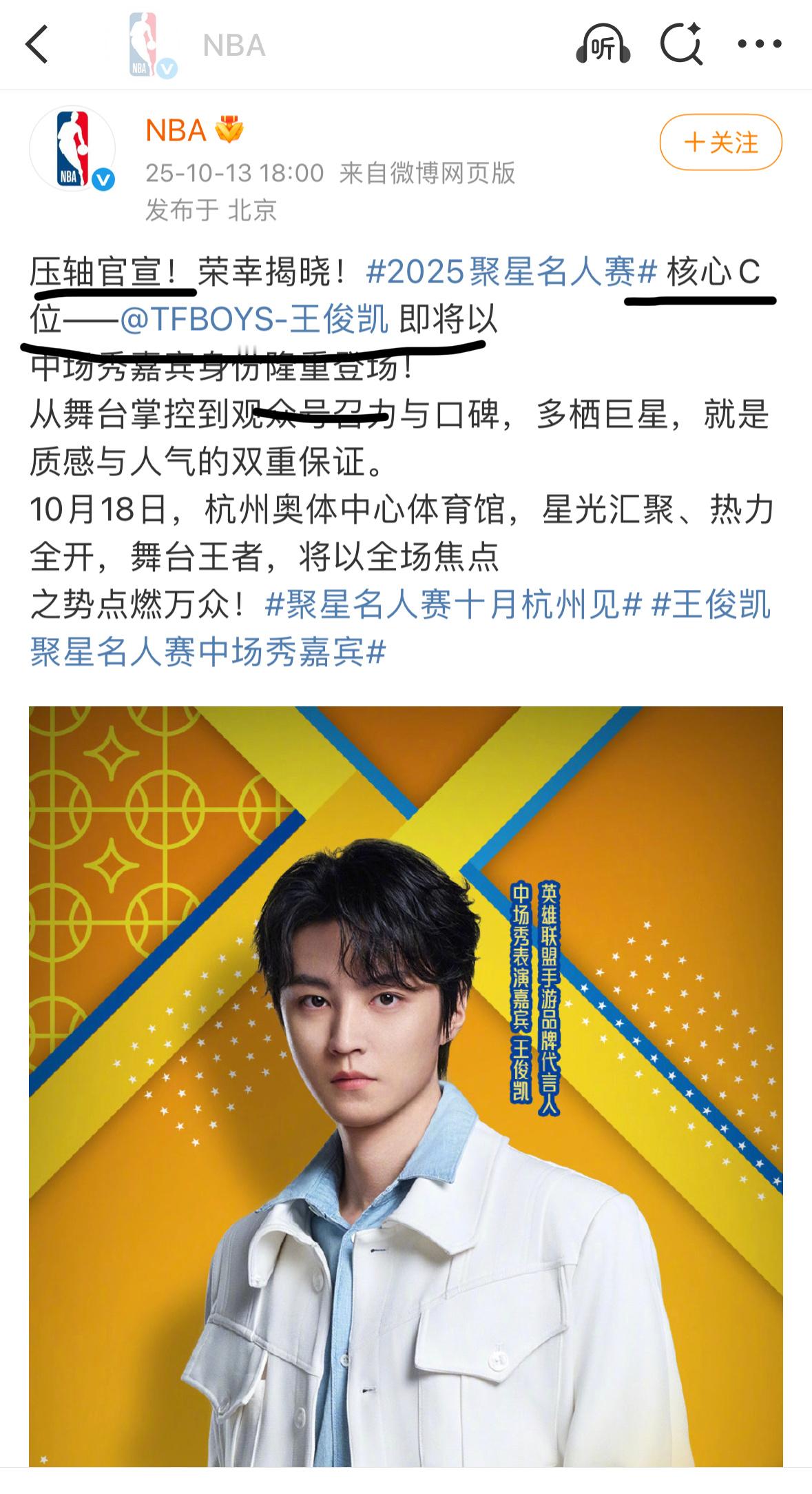 前段时间NBA那个海报争得很严重结果NBA官博出来认证了王俊凯是压轴官宣、核心C