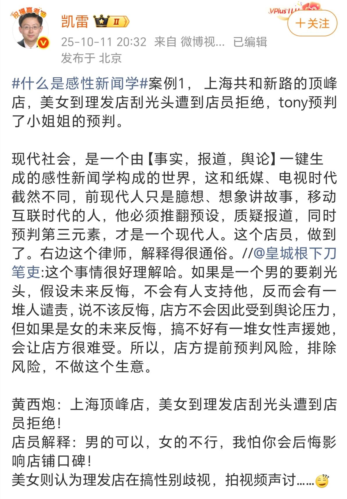我预判了你的预判。 上海一女子去共和新路的一理发店要求给自己理光头,被店方拒绝。女子拍视频进行了挖坑式提问,为什么女的不能剃光头。 店员回答:男的可以,女的不行。他怕你剃了光头之后后悔,影响店铺的口碑。 女子说,我自己来理的,不后悔。 然后,女子上纲上线了,说这是歧视……。店员一听这话,感觉不对劲啊,叫女的别拍视频, 说侵犯了他的肖像权。女的说,你先侵犯了我的消费权。 你是有消费权,但人家也有拒绝权! 这不还没有服务上呢?这网暴不就来了吗?但似乎这网爆是反方向的。 为什么在女方说她理光头不会后悔时,店方为什么仍坚持不理光头呢? 我猜店方的想法是:这是一个刺儿头,惹不起。要是真给她理了个光头,要是对方有理无理的找个理由来找麻烦,那就真的是麻烦大了,中彩票了。 对此你们怎么看?