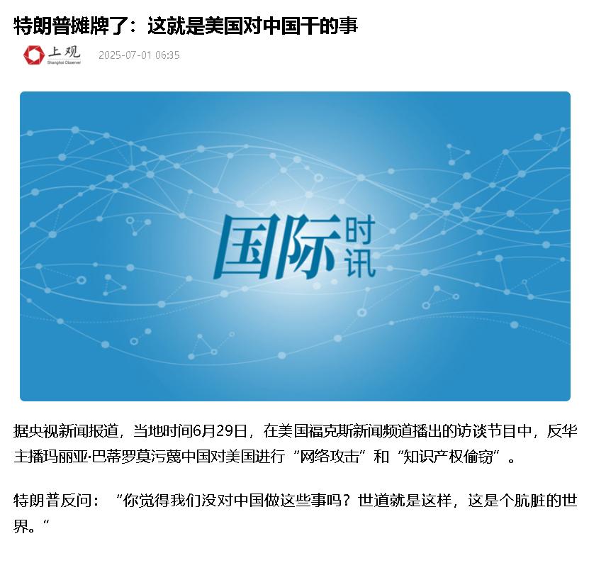 [下雨]特朗普太直了,直得你都有点不好意思说他坏,当主持人质问:“你怎么能信中国?”特朗普一句话当场打断:“你以为美国能好到哪里去?”接着他笑着说:“我们也干过那些事,还做了不少,世界就是这么脏。”当时那位女记者不断往中国身上扣帽子,说技术剽窃、芬太尼泛滥、疫情失控,听得人火冒三丈。特朗普这番话却把主持人噎得半天没接上话,脸都僵住了。 特朗普在接受福克斯新闻采访时的一番话,让很多人眼前一亮。主持人提出一堆中国相关的指责,像技术和毒品问题,话里话外都等着特朗普再添新火。 没想到,他一下子就把话题转回了美国自身,他说美国其实也干过那种事,世界上很多脏东西大家都有份。 这种直接的反应,别说主持人懵了,观众也有点意外,因为美国政客平时喜欢把自己说得很正直清白,总批评别人。这次特朗普完全不按套路来,让现场一下安静了不少。 这种表达方式跟特朗普一直以来的作风高度吻合,他向来不和别人虚与委蛇,做生意一样,国际关系也就是谁能多拿点好处。 美国在全球舞台上,不仅是把自己当赢家,更习惯把问题都推别国头上,可事实是情报、贸易、技术这些领域哪有谁真的干净?就算疫情、毒品泛滥,难道美国就一点问题没有? 这种赤裸裸的现实让很多人觉得痛快,因为特朗普没遮掩也没转移焦点,直接摊牌,这种风格也让观众不少人觉得终于有人敢承认,既然都是利益战,又何必假装道德高人。 尤其在美国社会,很多人早就厌倦了主流媒体那种单方面的叙事,老百姓看的不仅是政客表面说了什么,更关心背后到底谁占便宜。 特朗普说美国也做过那些事,说到底是要大家别再天真,不要一边骂中国,一边忘记美国自己暗中也做着类似的事。 这种坦率没把美国形象包装得那么完美,但却更接近现实生活,这比那些光顾着说漂亮话的总统靠谱多了,也不至于让人一听新闻就得装。 用大白话讲,世界本来就不是非黑即白的,只要有竞争,有利益,大家肯定都会为了自己动脑筋、下手,并不是只有一个国家才玩这些伎俩。 主持人沉默的画面在社交平台上被反复转发,成为了很多人讨论的焦点。支持者觉得这是特朗普最真实的一面,反对者则认为他其实是在玩另一套算盘。 不管怎么说,这个片段让大众重新审视国际政治,也开始思考平时哪些说法其实只是在转移注意力。 而且这并不仅仅是一场意外的访谈。特朗普之前就有类似公开表态,他批评欧洲国家在军事上搭美国便车、在贸易上不吃亏就不罢休,这些话也都让不少人觉得,他比起别的政客至少不怕把丑话说在明面上。 这一回也算是给大家上了一课。在大国竞争和国际交往中,没有谁真的完美,也没有什么铁板钉钉的坏人。所有的行为背后都是利益在驱动。
