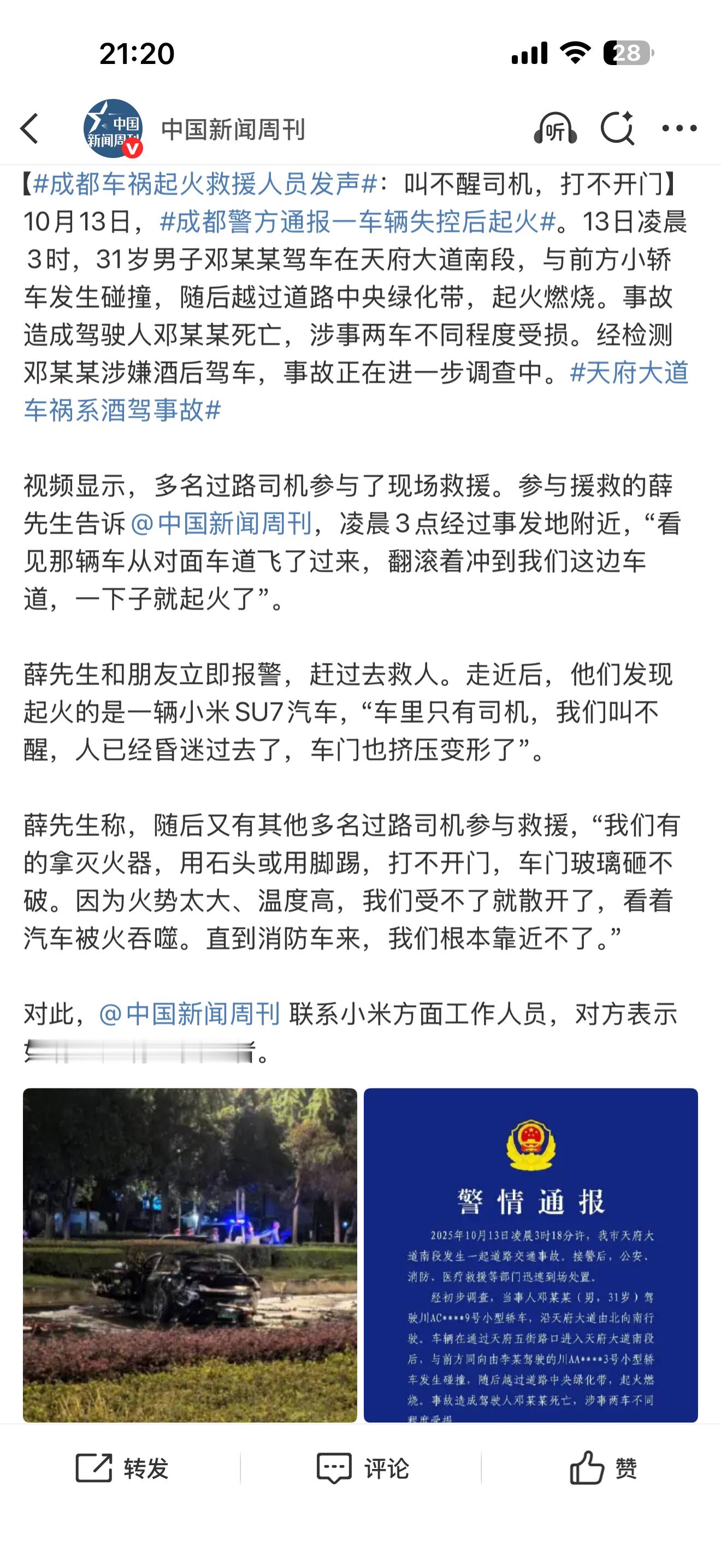 成都车祸起火救援人员发声 蓝底白字也来了,就是酒驾了。司机喝了酒还开车,不管开什么车都危险,跟品牌没关系。