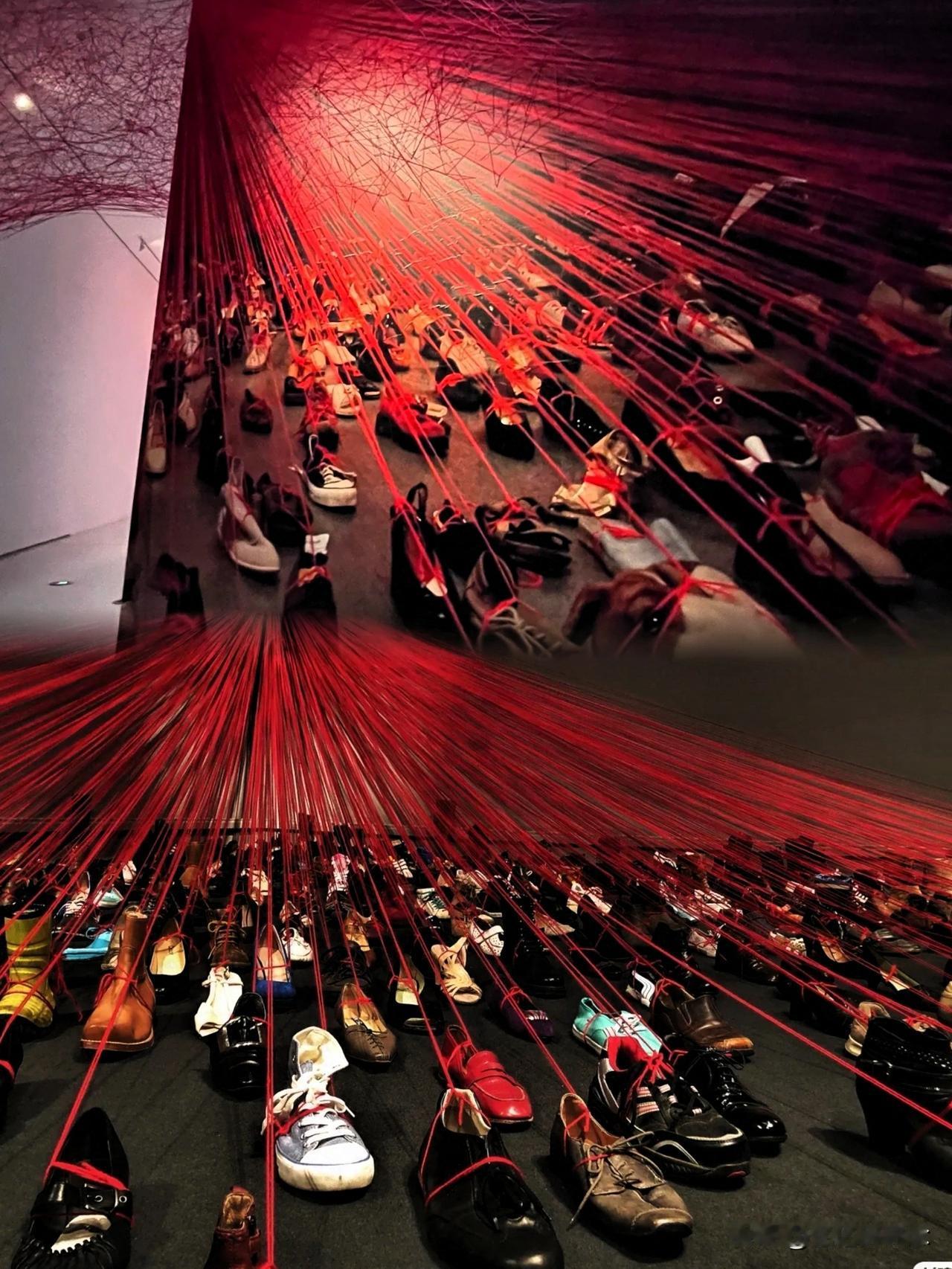 刚刚查了一下 北京朝阳区红砖美术馆,里面有一个展览,展览里有很多不同的鞋子,这些鞋子不是随便摆放的,而是用红线牵着的,红线从一双鞋子延伸到另一双鞋子。 很奇怪的是,这些鞋子有什么关系呢?到底红线想表达什么呢? 盐田千春常以线和日常旧物为素材进行创作,线象征着联结 可连接任意两点:就像人与人之间既纠缠又复杂的关系,而鞋子承载着主人的记忆与痕迹,通过红线相连,证实了每个人的“存在”,体现了“缺席的存在”这一创作核心。 你们说值不值得去看?