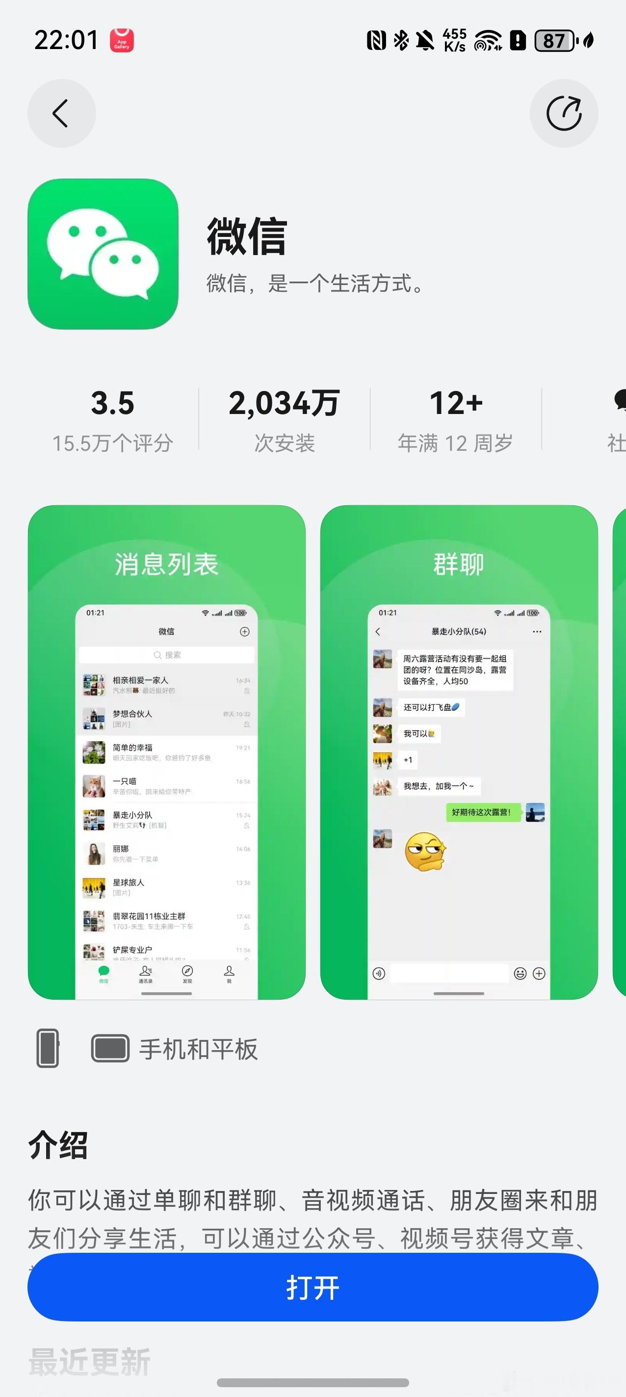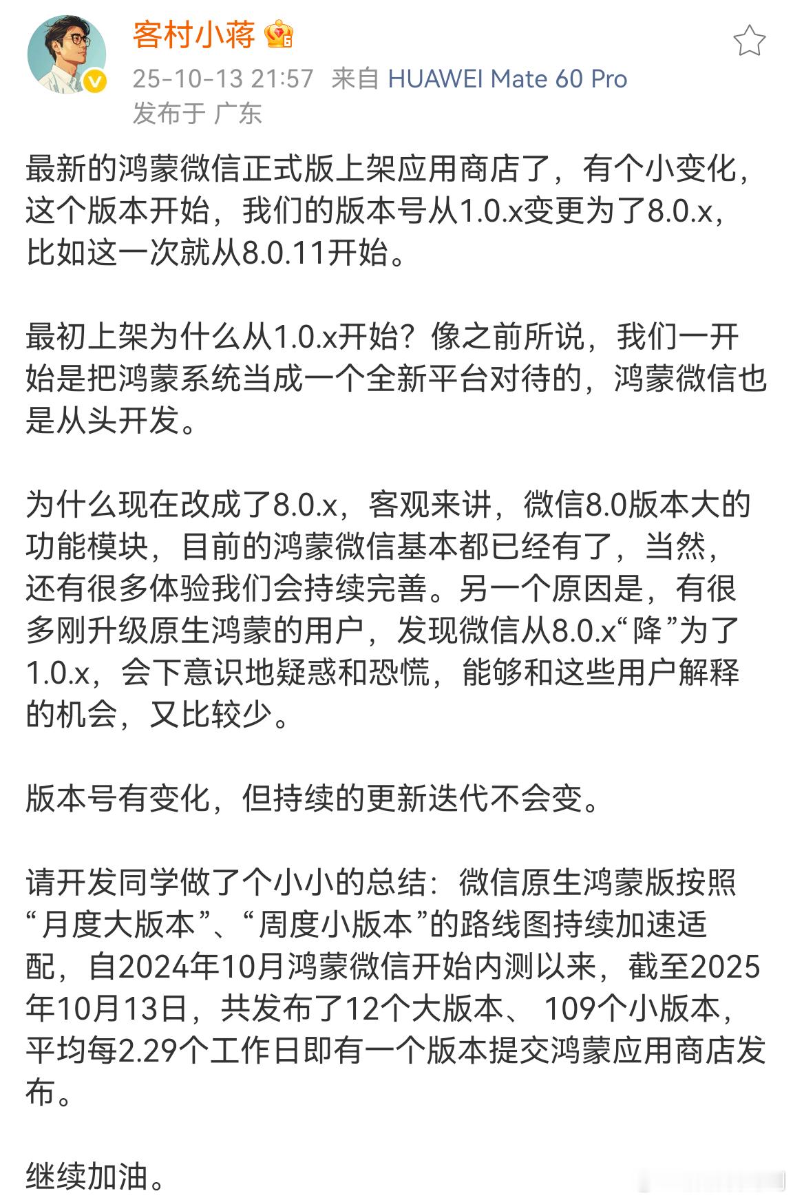 目前,微信原生鸿蒙版按照“月度大版本”、“周度小版本”的路线图持续加速适配,自2024年10月鸿蒙微信开始内测以来,截至2025年10月13日,共发布了12个大版本、 109个小版本,平均每2.29个工作日即有一个版本提交鸿蒙应用商店发布。鸿蒙微信迭代速度极快,也说明了腾讯对鸿蒙系统发展的充分支持和肯定。鸿蒙越用越香我的鸿蒙体验华为[超话]鸿蒙5大有不同
