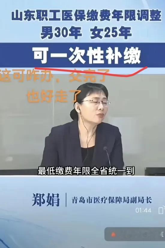 好客山东这波医保调整, 直接给全国打了个样! 2026年1月1日起, 职工医保年限男30年、女25年的新规就要落地, 没缴够的要么一次性补,要么按月续,不然退休后没法享医保待遇。 这可不是突然变卦,之前青岛、烟台那些“男25年、女20年”的旧标准,本就是过渡阶段。 而且不只是山东,广东、四川都在往这个标准靠,全国统一大概率是迟早的事。 别光骂“门槛高”,其实是医保统筹要往省级、全国走的必然。 但对快退休的人来说,一次性补缴要掏不少钱,按月续又怕总花费更高,确实两难。 这政策核心该是“保长远”,可也得顾着当下人的实际压力。 你们查自己的缴费年限了吗?差得多的话,会选一次性补还是按月续?医保新政策